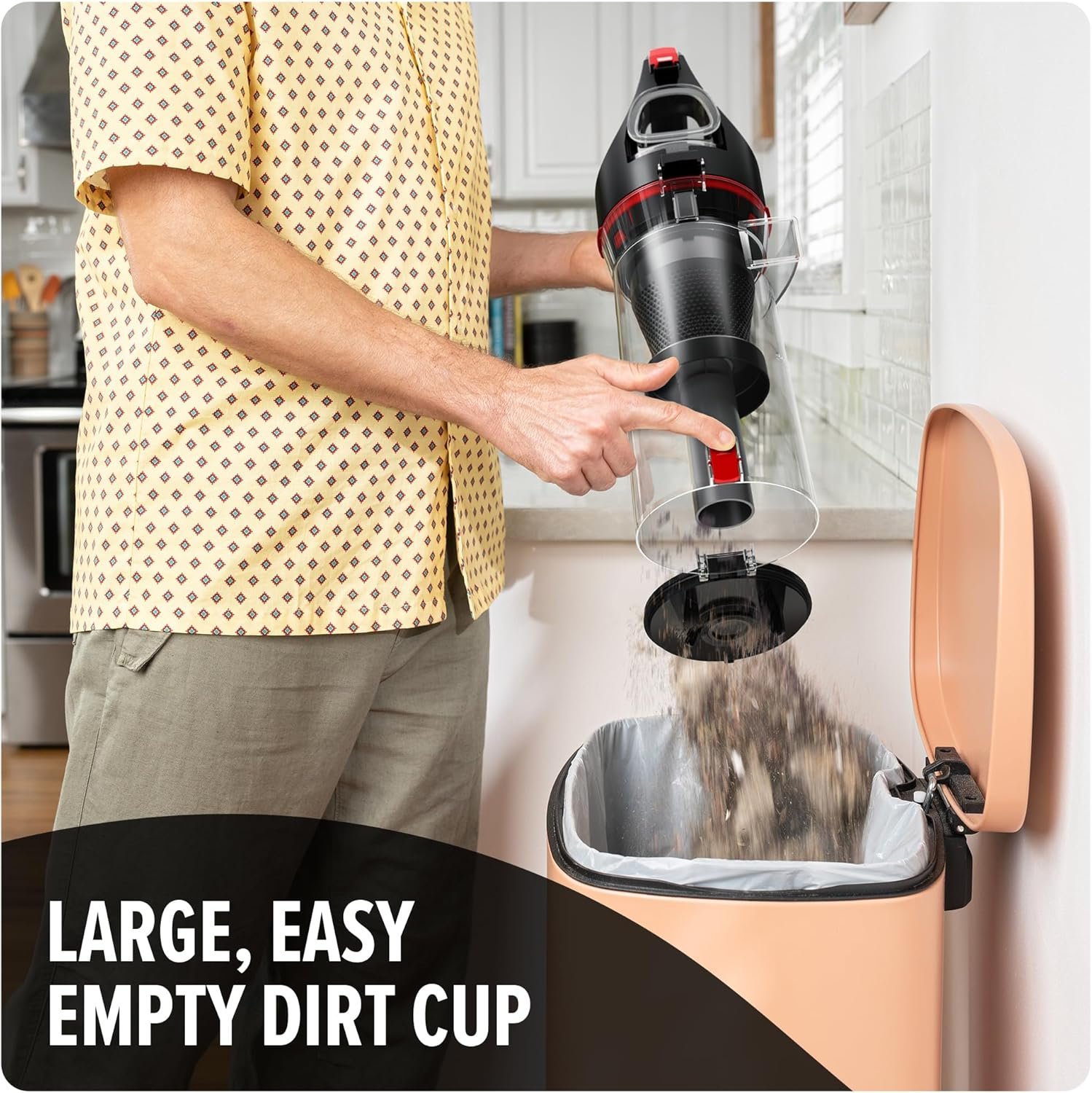 EASY-EMPTY DIRT CUP: This Dirt Devil vacuum cleaner features a one touch, easy-release, large dirt cup so you take fewer, quicker and easier trips to the trash.