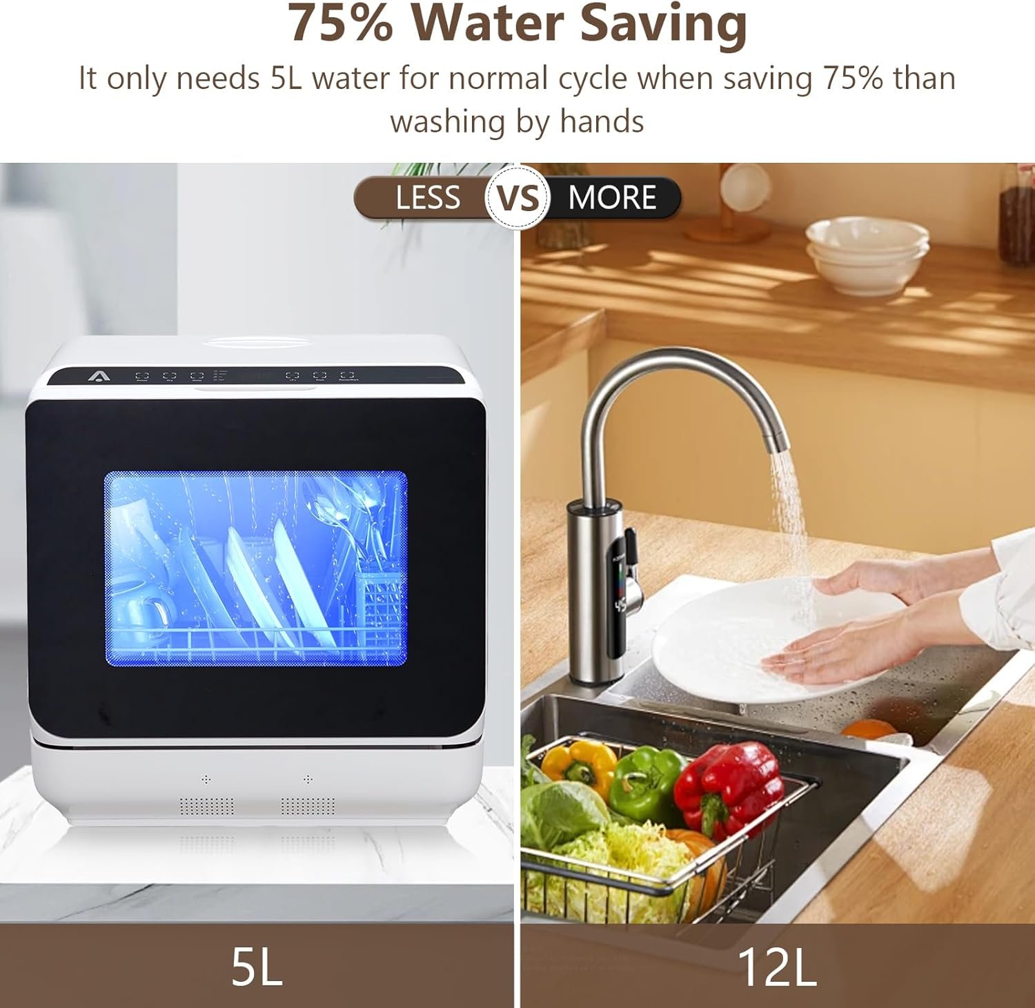 Dishwasher Countertop with 5L Built-in Water Tank, Portable Dishwashers for Apartments RVs, 5 Washing Programs, PTC Hot Air Drying & Inlet Hose, 360° Dual Spray Arm, Mini Dish Washer for Dorm