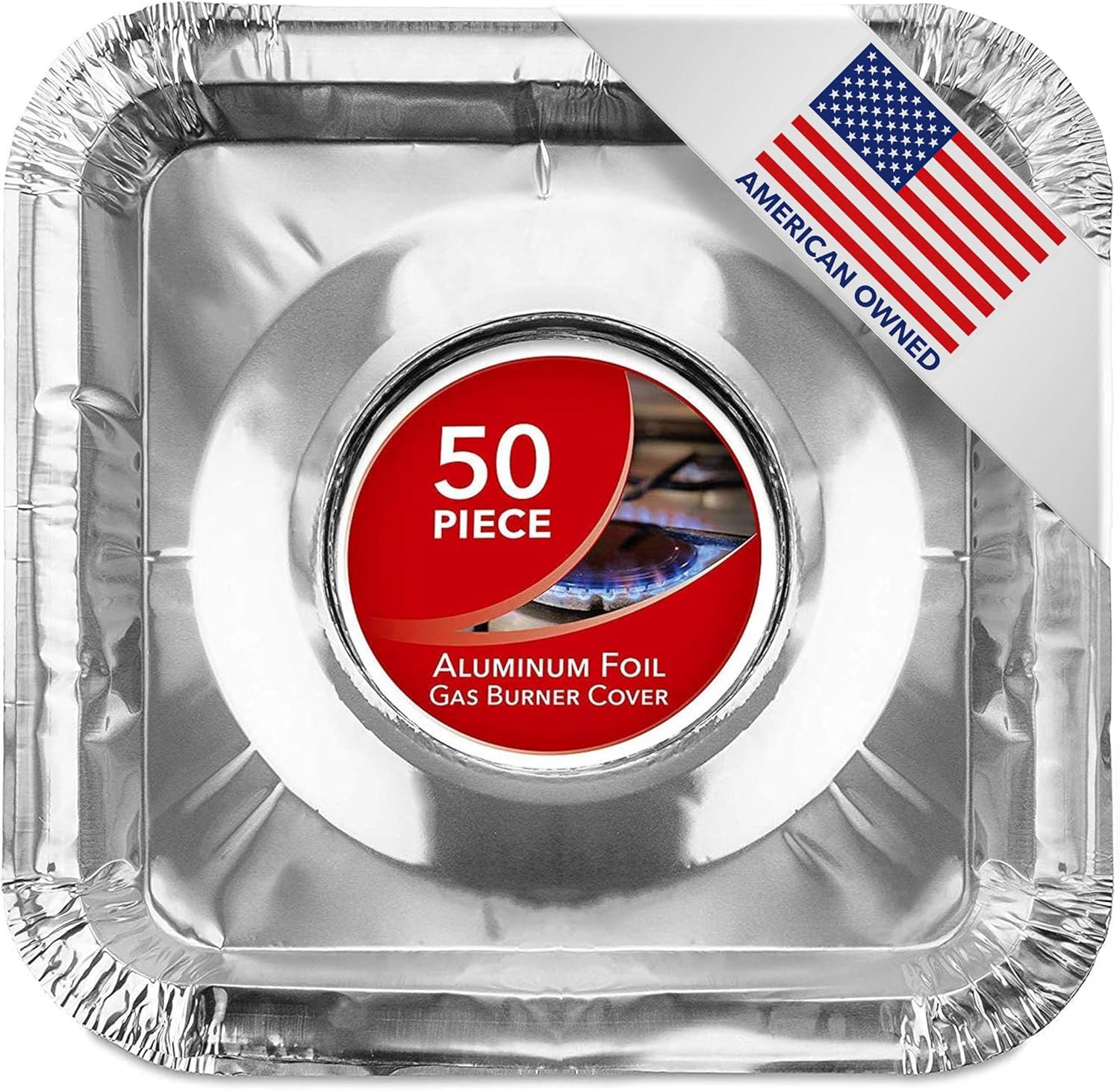 Disposable Gas Burner Liners (50 Pack) Aluminum Foil Square Gas Stove Burner Covers – 8.5 Inch Gas Range Protector, Stove Top Covers for Gas Burners, Foil Liners to Catch Oil, Grease, and Food Spills
