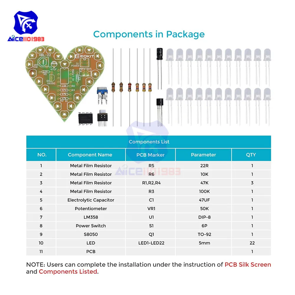 10 reviews for diymore Heart Shape LED Flashing Light DIY Kit with PCB DC 4-6V 4 Color Available for Soldering Kit Practice Learning Kit