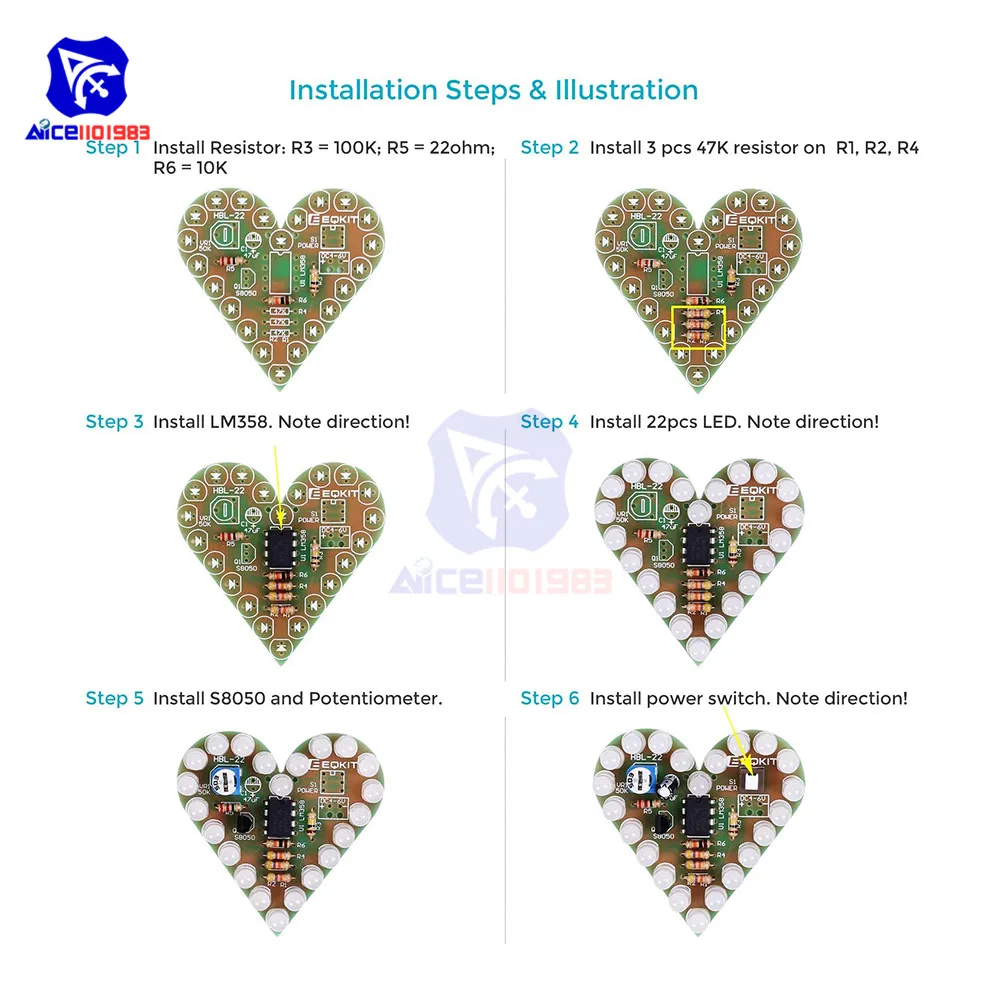10 reviews for diymore Heart Shape LED Flashing Light DIY Kit with PCB DC 4-6V 4 Color Available for Soldering Kit Practice Learning Kit