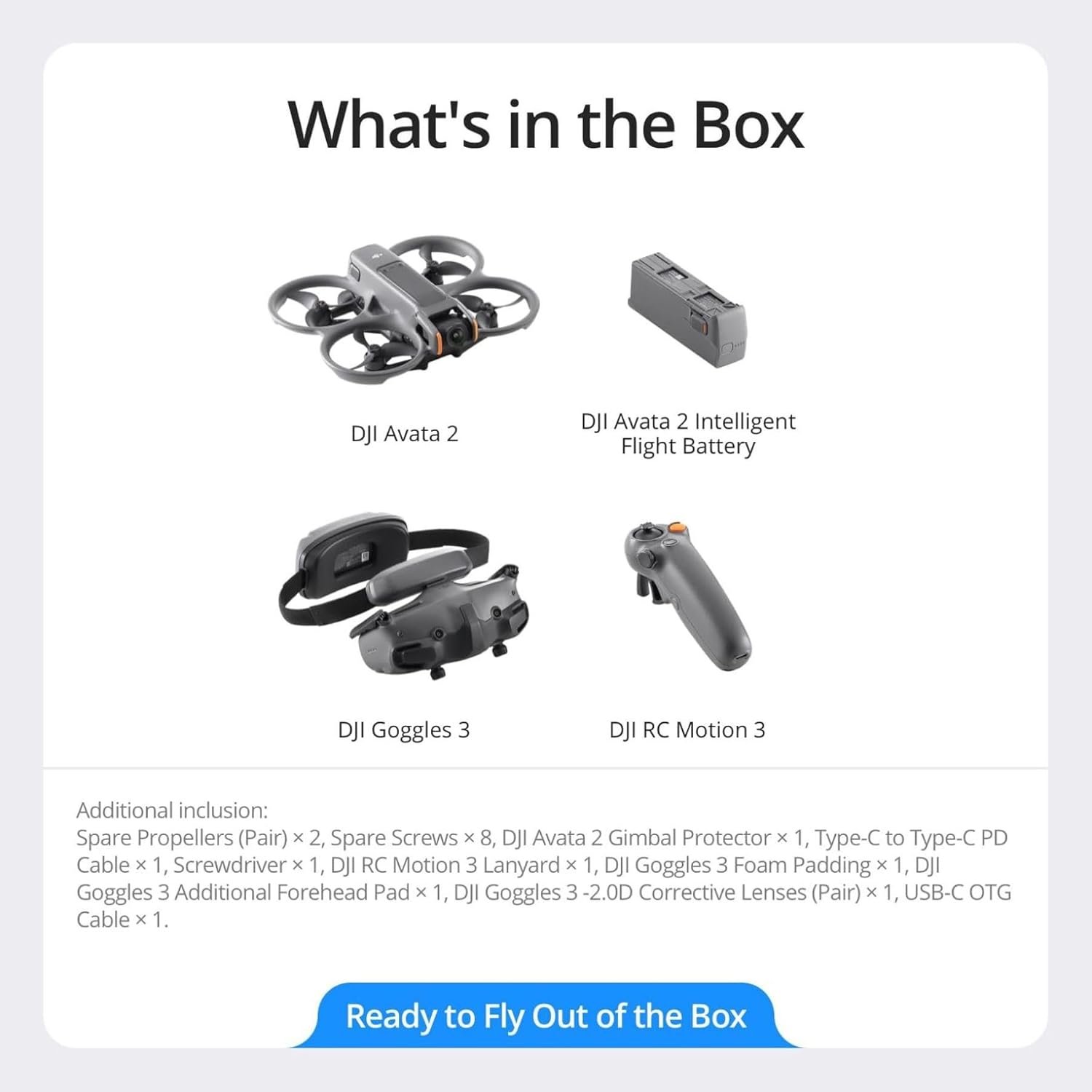 DJI Avata 2 Fly More Combo (1 Battery) includes everything in the Drone Only options as well as DJI RC Motion 3, DJI Goggles 3, and more. Great for new users who want the full FPV experience.