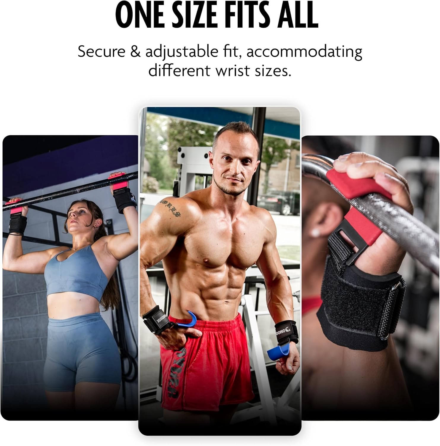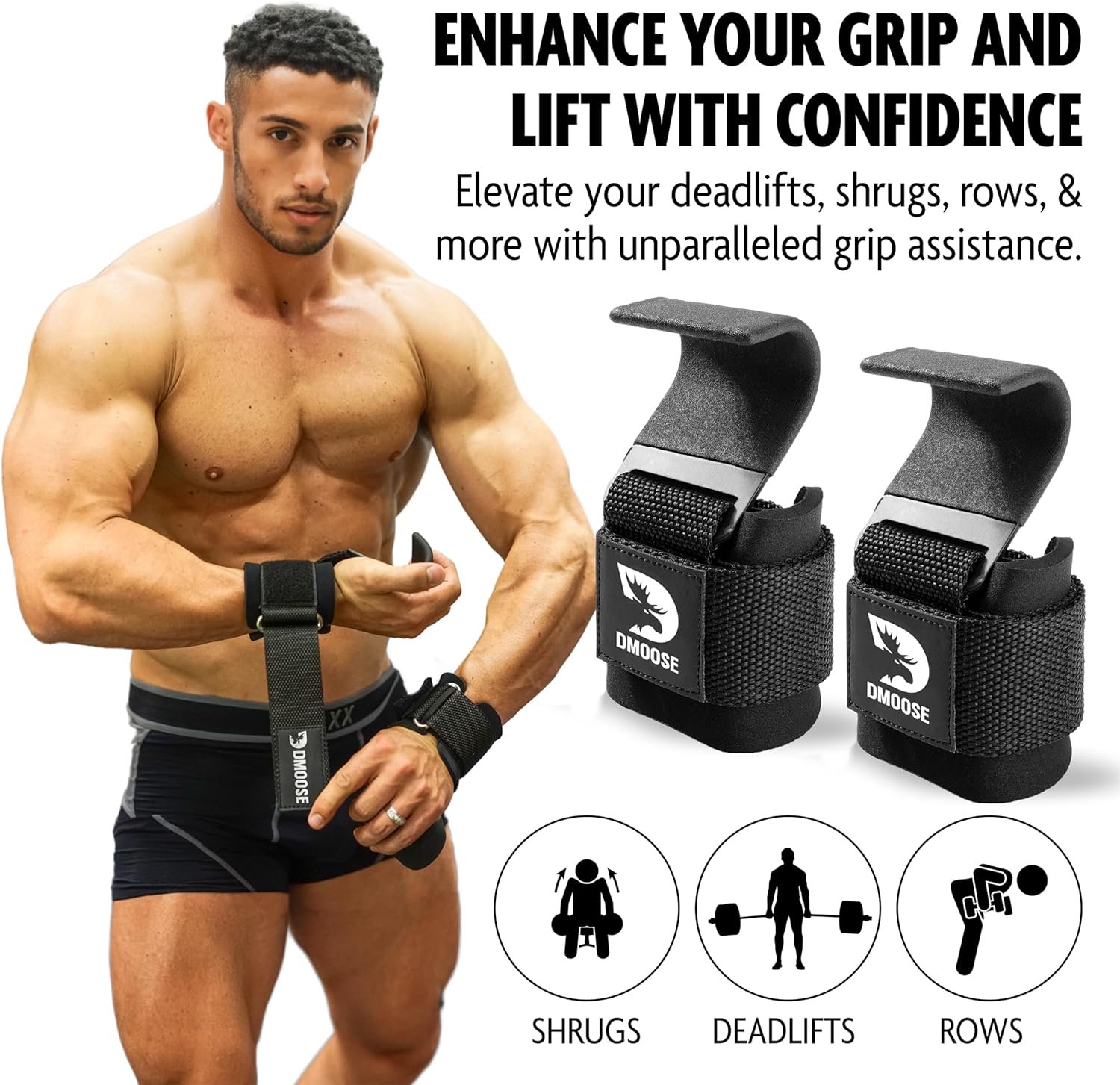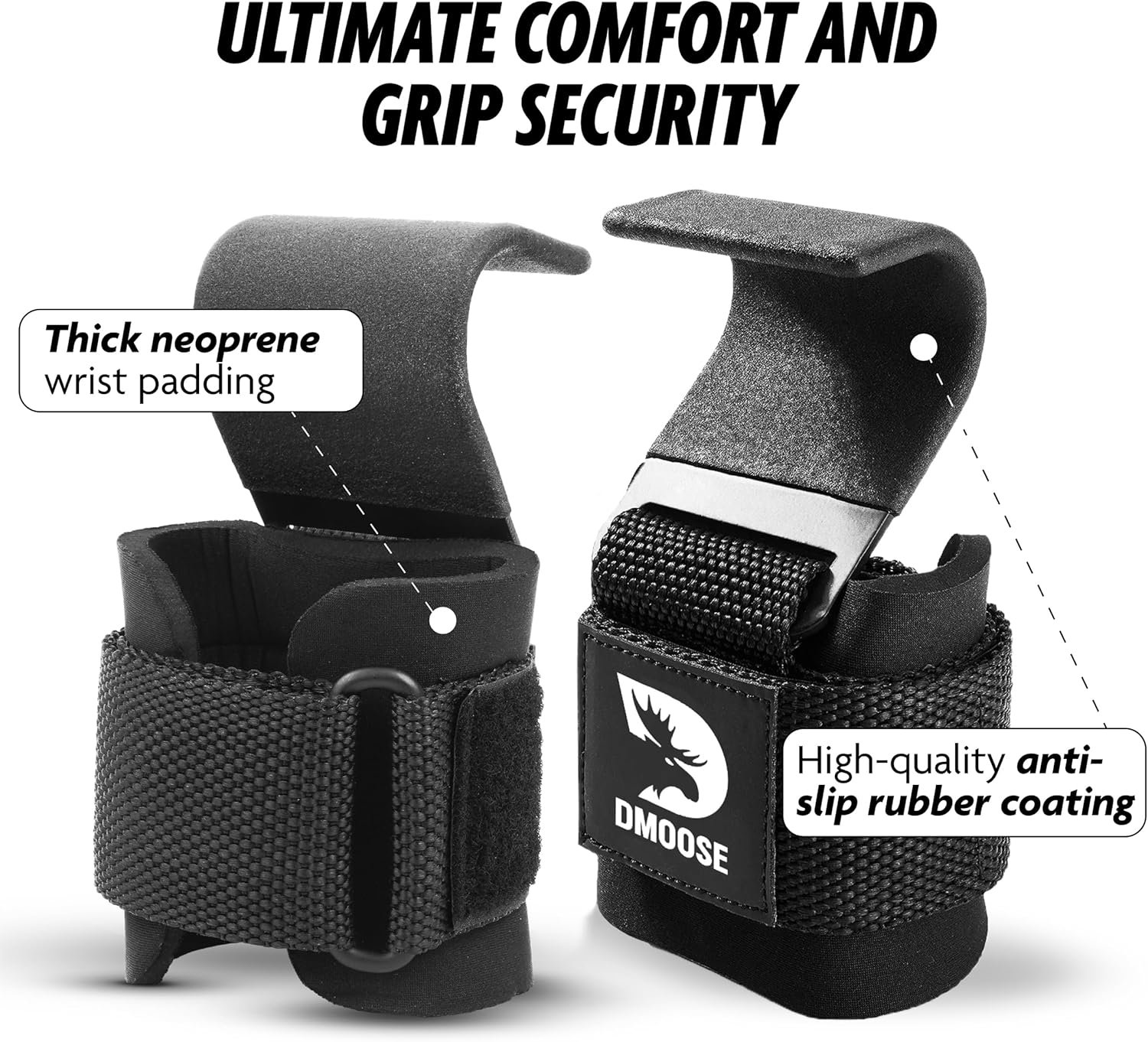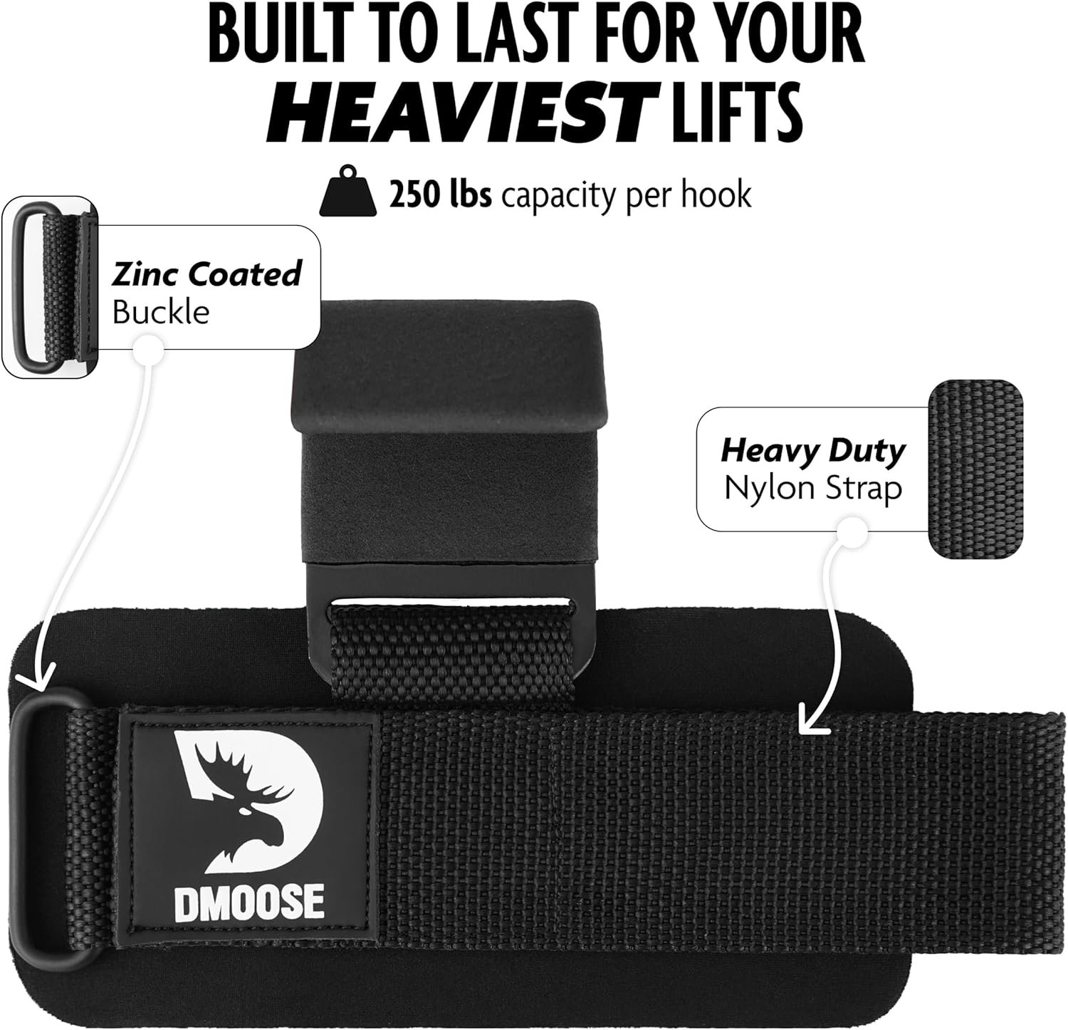 DMoose Fitness Weight Lifting Hooks for Men & Women (Pair) – 8 mm Thick Wrist Padding – Weight Grips for Powerlifting, Shrugs, Rows & Deadlift Support – Gym Lifting Straps with Pull Up Hooks