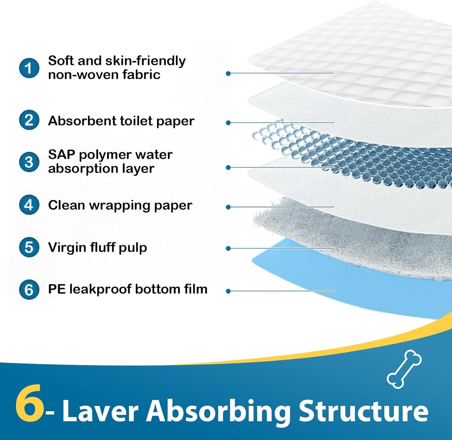 MULTI-lAYER DESIGN: Disposable dog pee pads features a 6 protectional layers design which quickly asborb and lock the liquid without leaking, protect the floor, bedding, chair and furniture