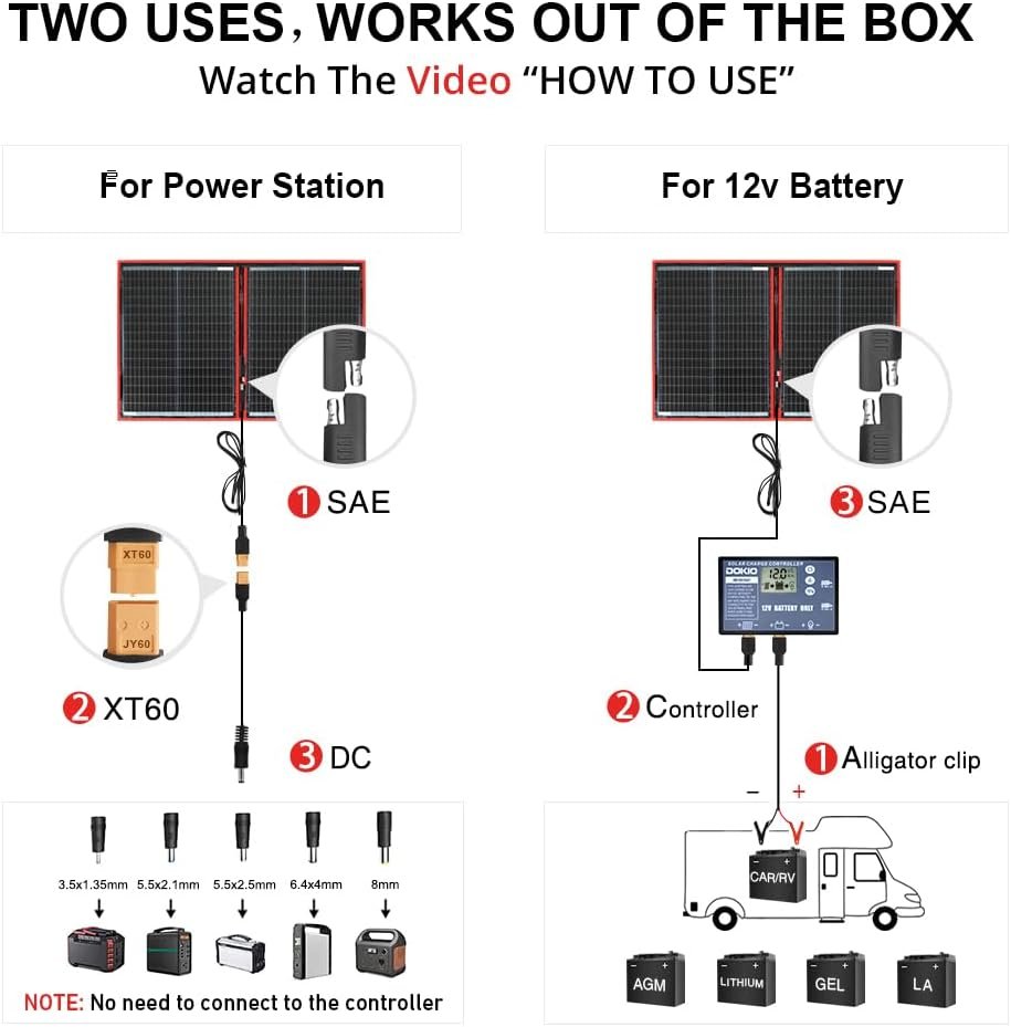 【PERFECT CHOICE FOR OUTDOOR AND EMERGENCY LIFE】– 9.85ft (3m) cable length from panel to controller, For most power stations (Jackery,Goal Zero,Ecoflow,Paxcess) and 12-volt batteries(AGM,LiFePo4,Deep cycle batteries),RV,car,boat,trailer,truck,pumpa,camping,van,emergency power