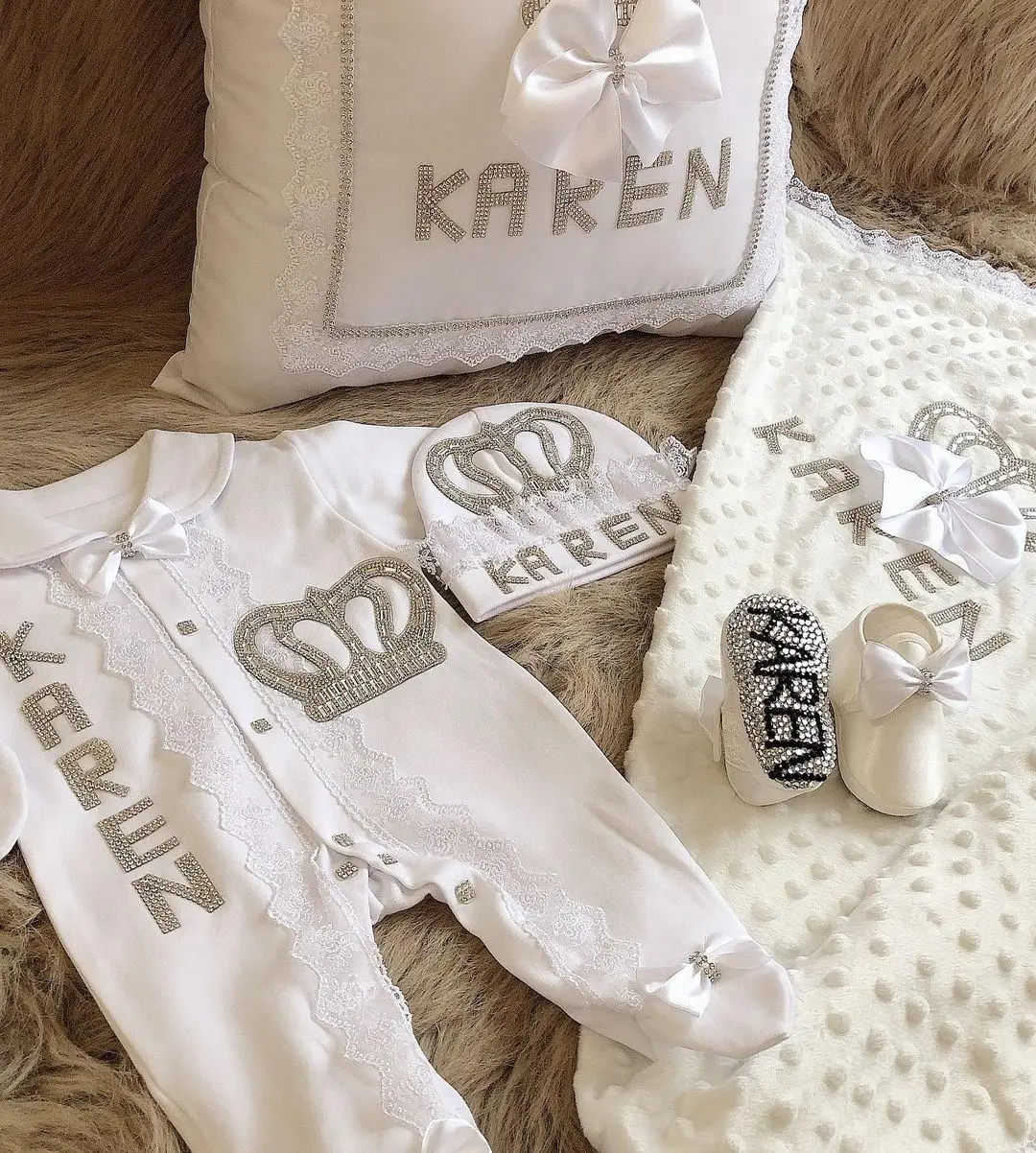 Our 4 pieces set is made up of soft, thick cotton. They are embellished with rhinestone buttons, crown jewels and bows.