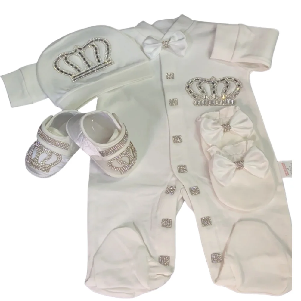 Dollbling Baptism Outfit Boy Prince Luxury Bling Christening Coming Home Romper Bonnet Set Mittens Nursery Hospital Clothing set