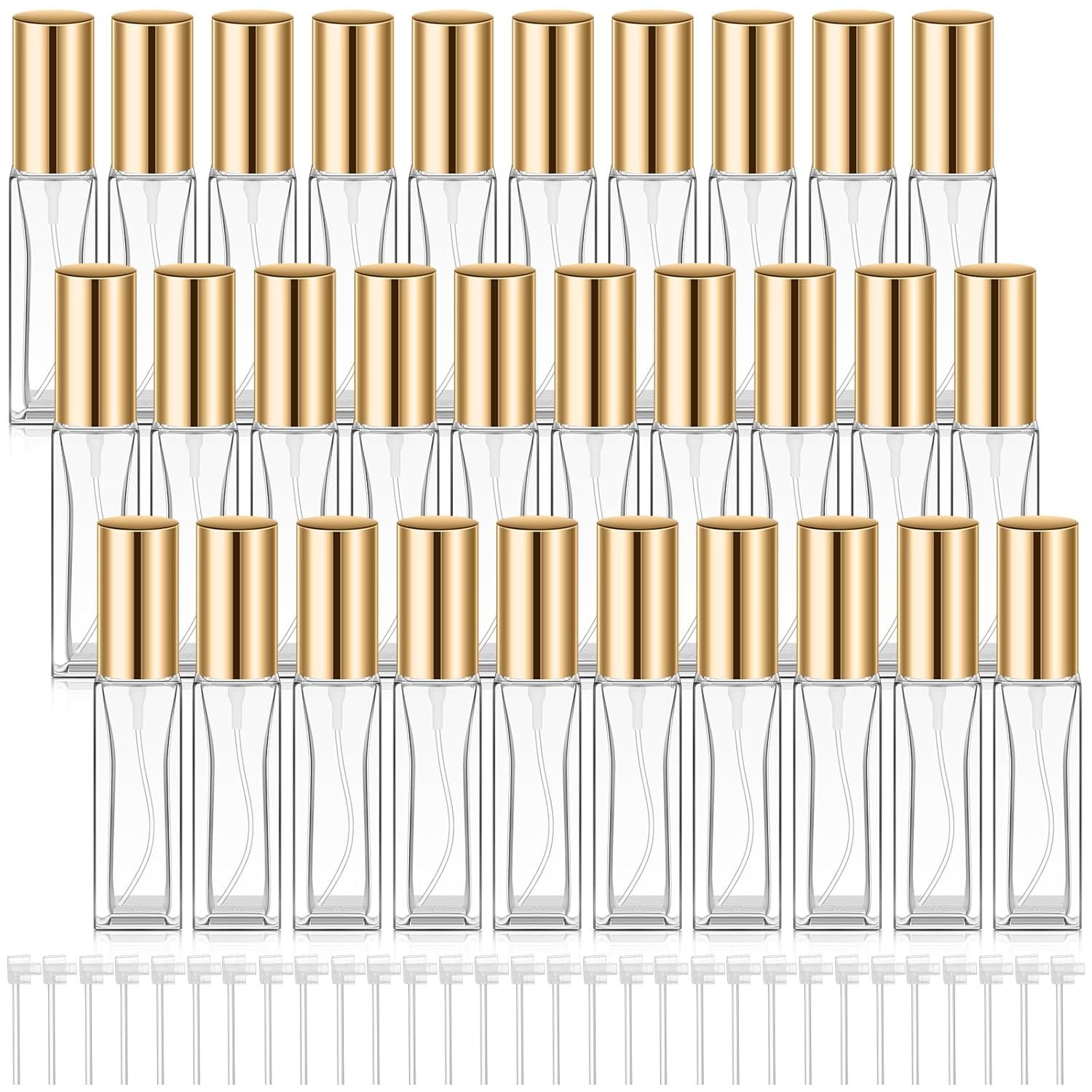 Domensi 30 Pcs Glass Perfume Travel Refillable Bottles 10 ml Mini Cologne Perfume Bottles Empty No Leak Travel Size Atomizer Spray Mini Clear Sample Dispenser (Gold)