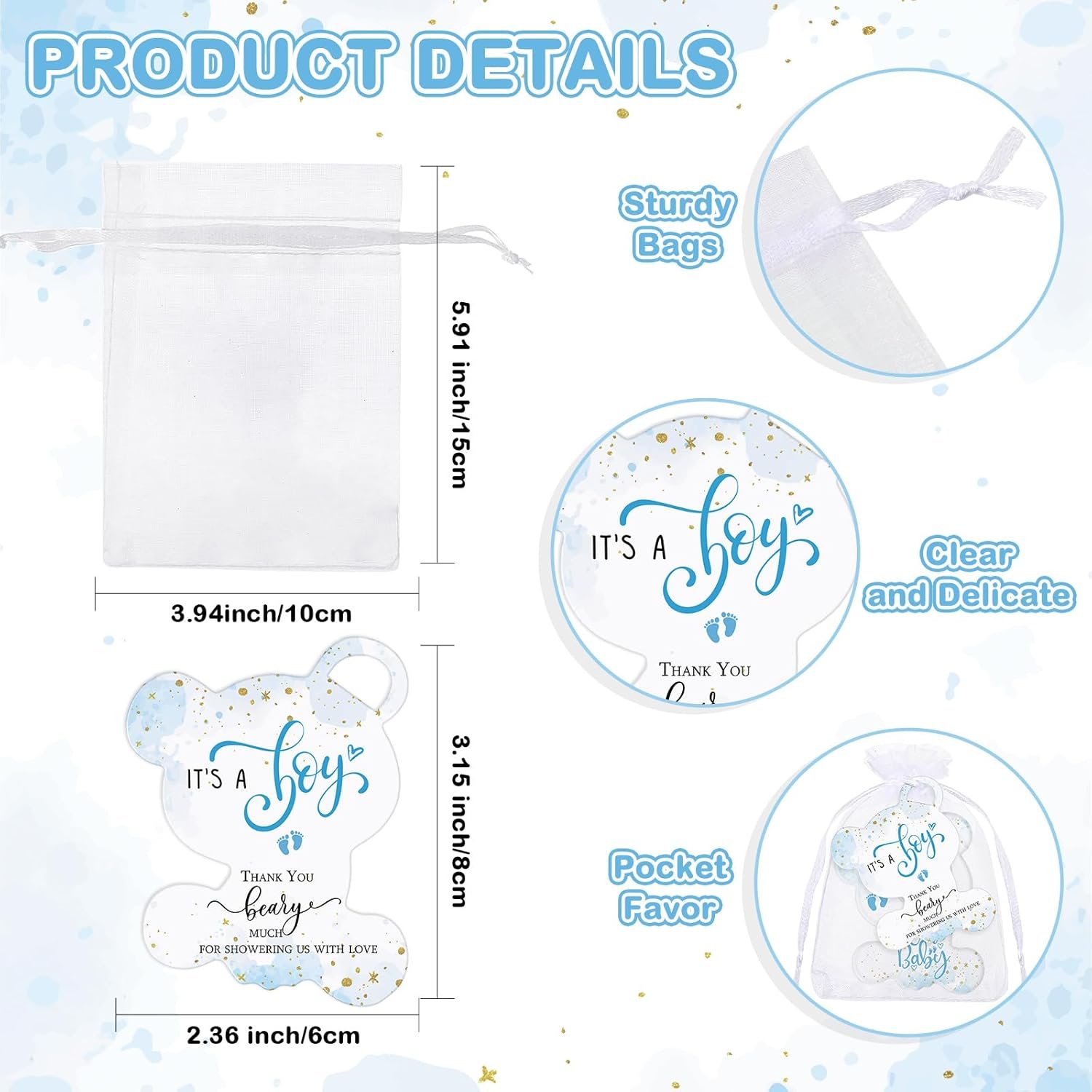Designed with careful consideration, the baby shower bear opener fridge magnet, the thank you card, and the organza bag, all come in handy sizes. Their dimensions ensure pleasant handling and easy transportation, adding more charm to your baby shower party.