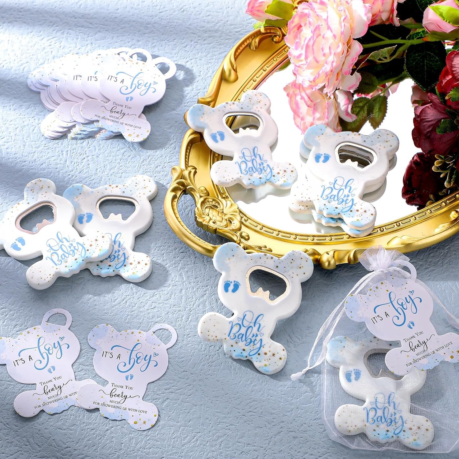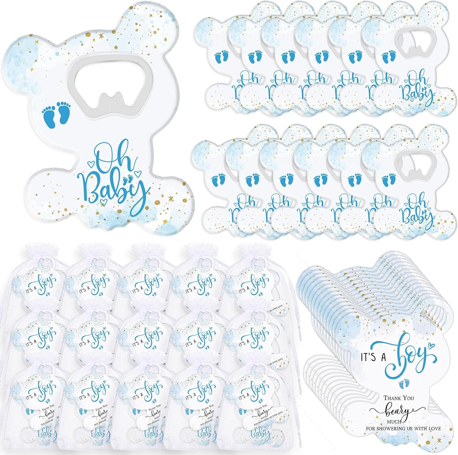 Domensi 75 Pcs Baby Shower Bear Party Favors 25 Bear Bottle Opener Baby Boy Girl Fridge Magnet 25 Thank You Card and 25 Organza Bag Gender Reveal Party Favors for Souvenirs(Boy)