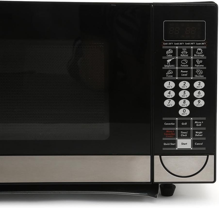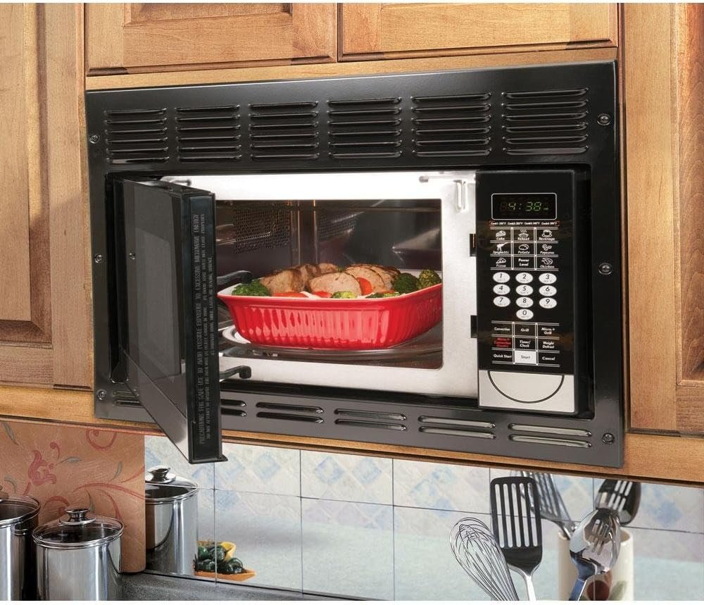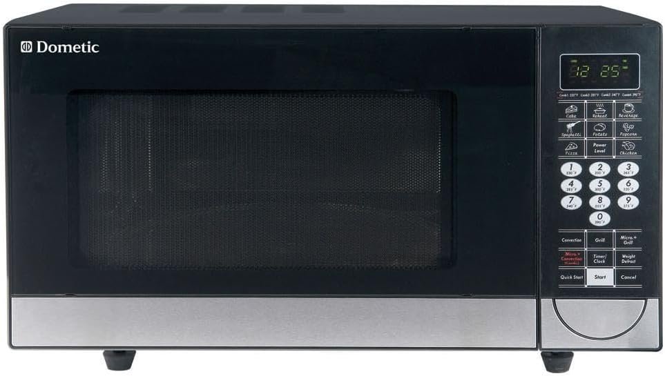 Grill and Convection Microwave, Black1.1 cubic foot capacity to help conserve counter space while allowing plenty of room to cook1000 watts cooking power10 adjustable power levels to let you boil, reheat, defrost, and more Speed and weight defrost9 pre-programmed, 1 touch digital cook settings allow easy preparation of potato, popcorn, pizza, frozen entrees, beverages & reheat Digital timer and digital clock with LED display Removable glass turntable rotates food to provide even cooking Child safety lock to prevent unsupervised usage Stainless steel cavity, black oven & trim kit, with stainless steel trim adds style to your RV kitchen Trim kit and exhaust kit included Model: DCMC11B.FWeight: 35 lbs. Outside dimensions (H x W x D): 12-7/8″ x 21-1/4″ x 15-11/16″Built-in dimensions (H x W x D): 20-3/4″ x 25-1/4″ x 19-9/16″