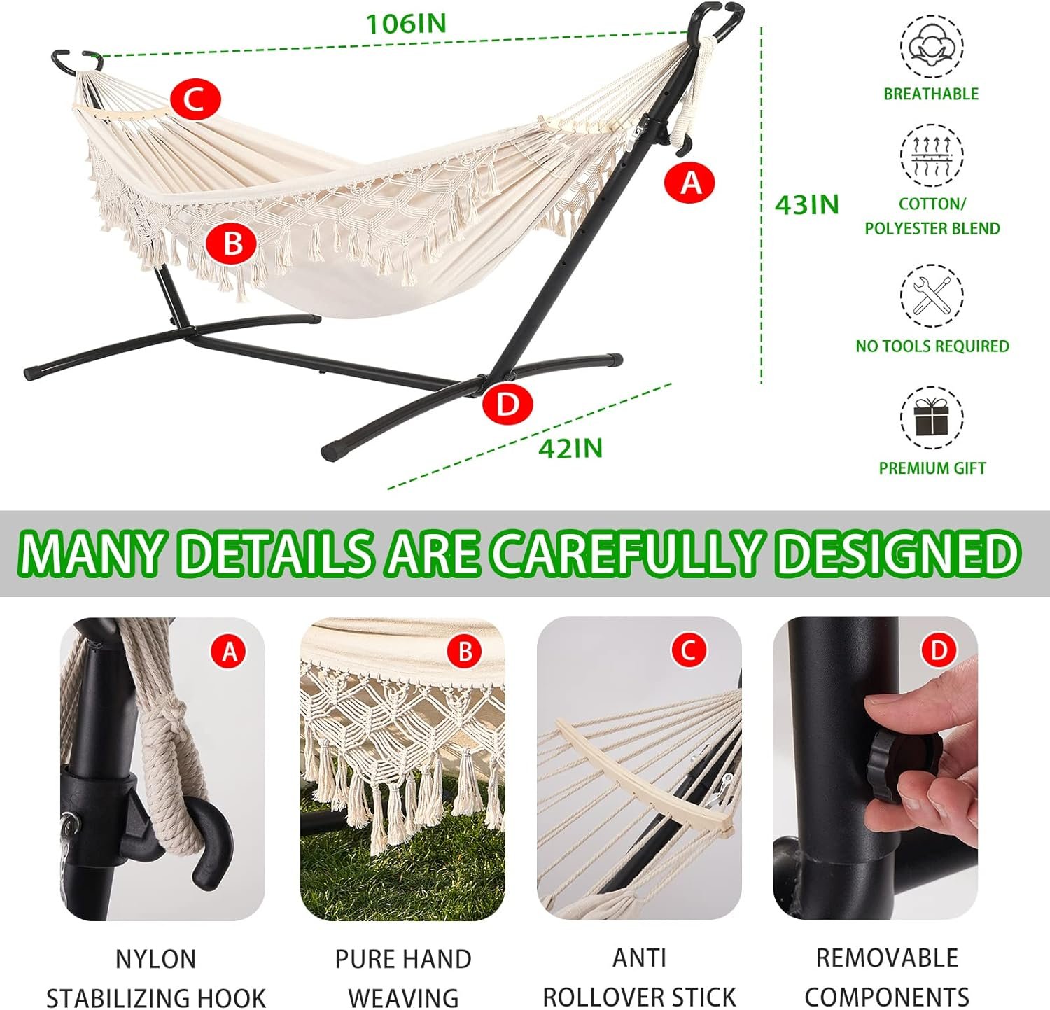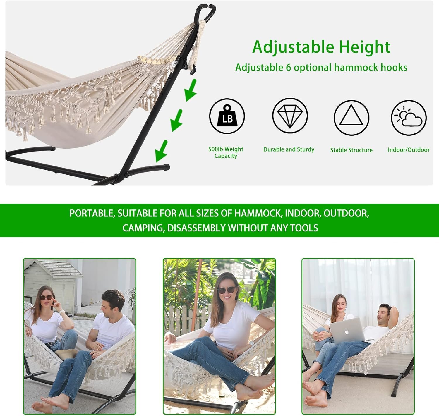 ✅【Easy to assemble 】 Easy to assemble and disassemble in a few minutes without any tools. It has six adjustable height options to adjust the comfortable height of the hammock better. Perfect for sleeping, relaxing, indoor and outdoor, patio/deck/balcony/porch/patio/lawn/garden/beach/park/pool or camping, picnic, hiking, traveling.