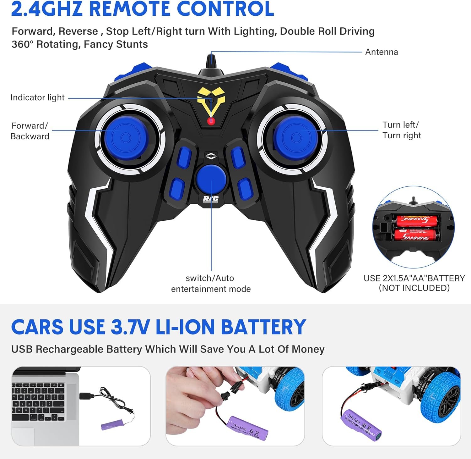 2.4Ghz Anti-Interfernce Control: Use 2.4Ghz non-interference remote control allows multiple remote control cars for boys to race at the same time. Switch on/off the demo button, the RC cars will do the stunts themselves. The ultra-flexible and swift characteristics ensure a higher-performance racing experience.