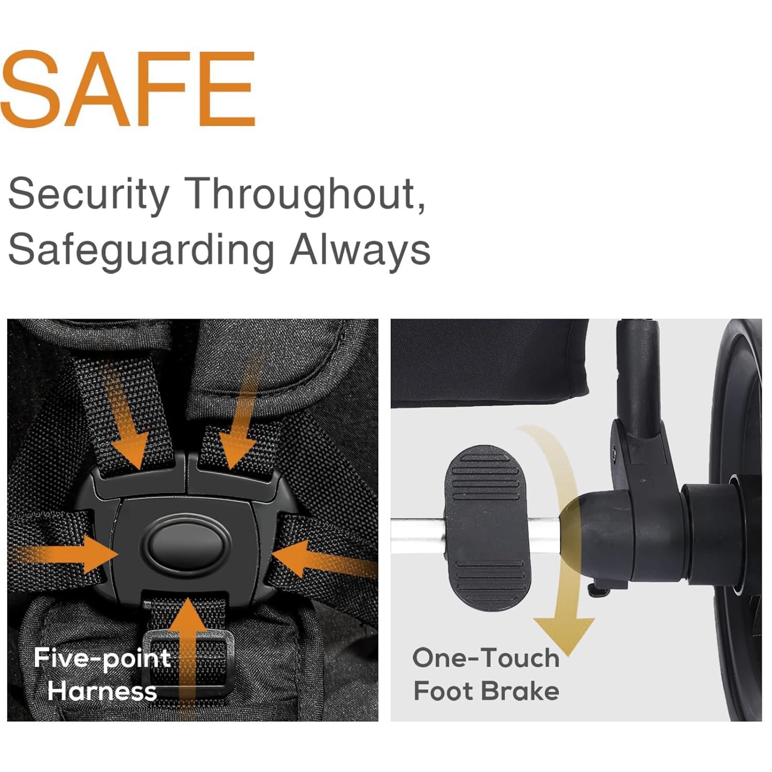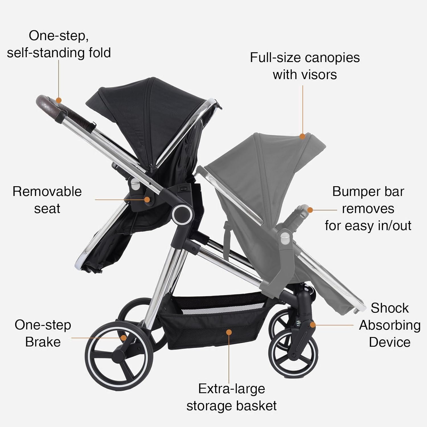Safety Features: The adjustable canopies protects your baby from harsh sunlight. The front wheels are shock-absorbing and easy to maneuver, while the rear wheels have a one-step brake. Each seat is equipped with a 5-point safety harness for added security