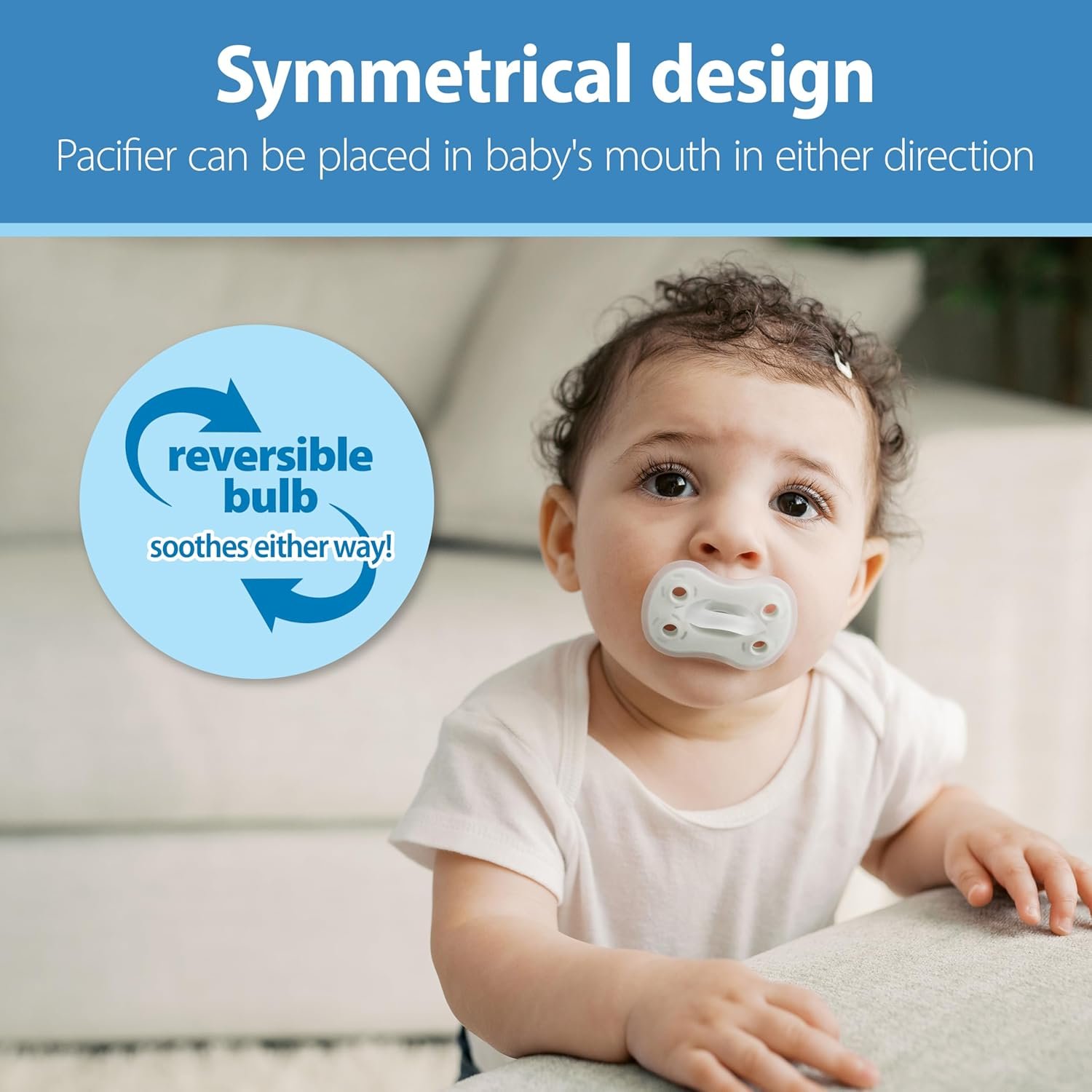 REVERSIBLE PACIFIER. Designed for easy acceptance, Dr. Brown’s Advantage One-Piece Silicone Pacifier is a fully symmetrical and reversible soother so it can go in baby’s mouth in either direction.
