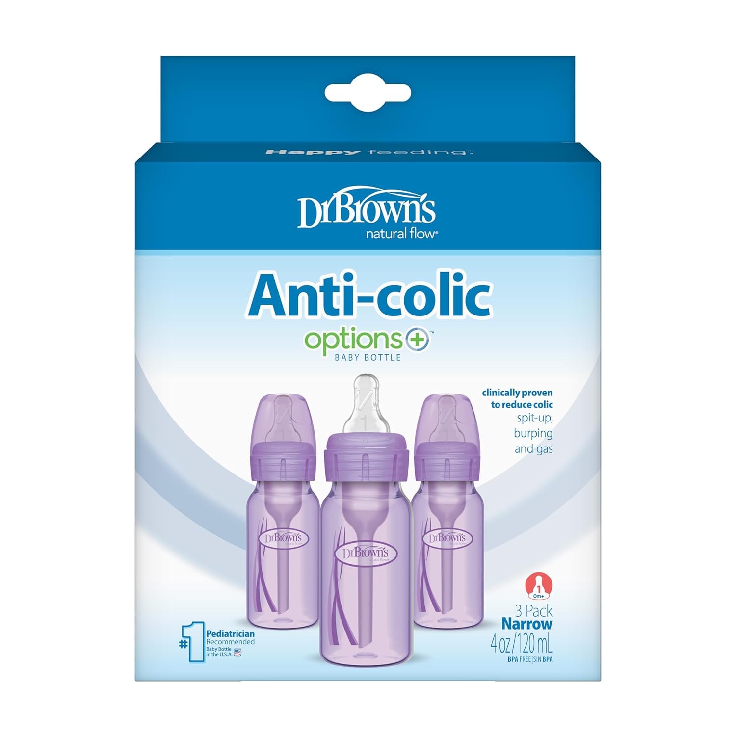 Dr. Brown’s Natural Flow® Anti-Colic Options+™ Narrow Baby Bottles 4 oz/120 mL, with Level 1 Slow Flow Nipple, 3 Pack, 0m+ Lavender