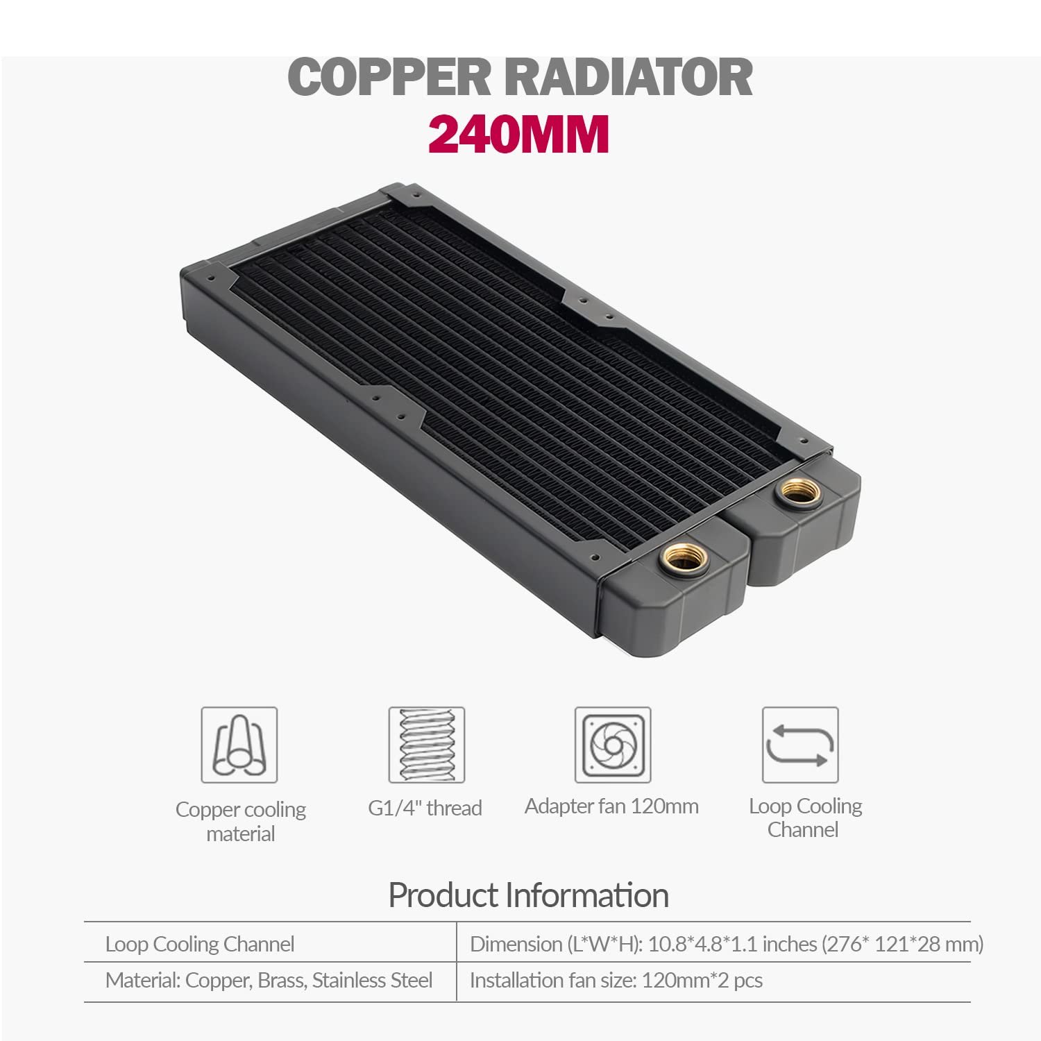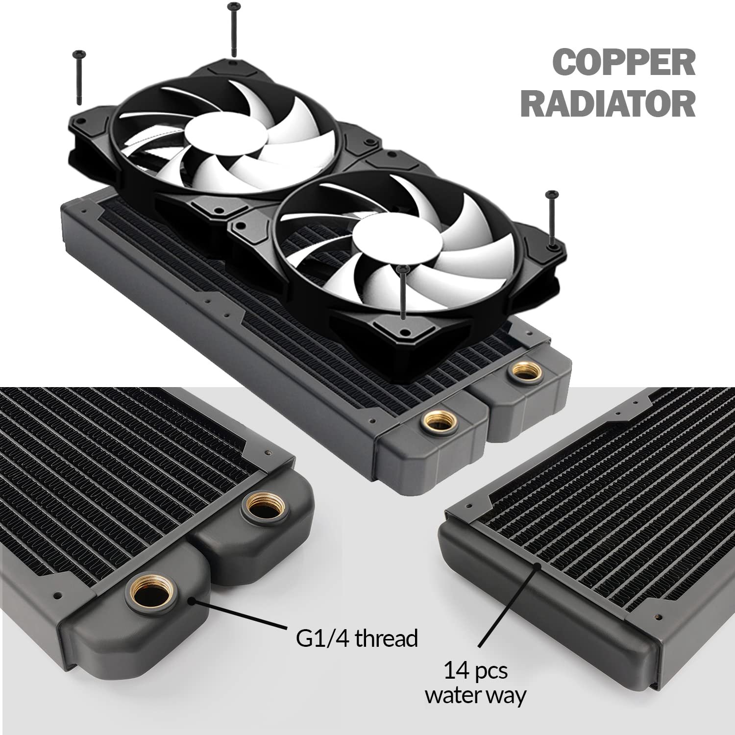 Dracaena.io 240mm – 28mm/1.1inch Thick Computer Radiator, 14 Tubes Copper Water Cooling Cooler for CPU Heat Sink – Liquid Heat Exchanger Dual G1/4 Thread, Black