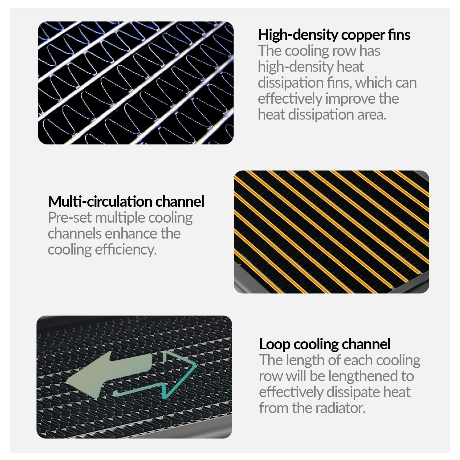Optimized Heat Transfer: Achieve maximum heat dissipation at all airflow levels. Our radiator is meticulously optimized to efficiently draw heat away from your cycling coolant, maintaining CPU stability and smoothness.
