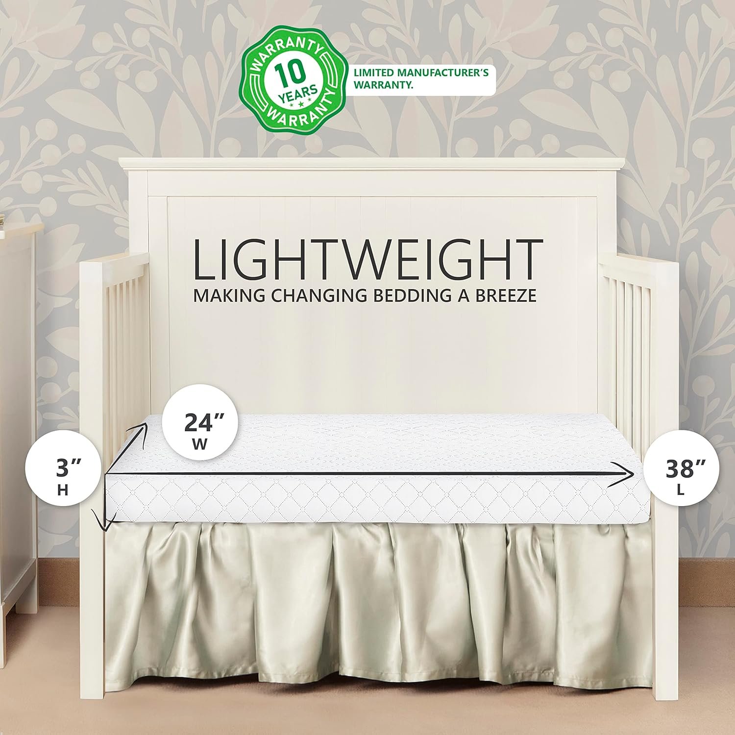 LIGHTWEIGHT & DURABLE: The mattress weighs only 3.5lbs and the square corner design adds to its snug fit feature in mini/portable cribs. Warranty: 10 Years Limited Warranty