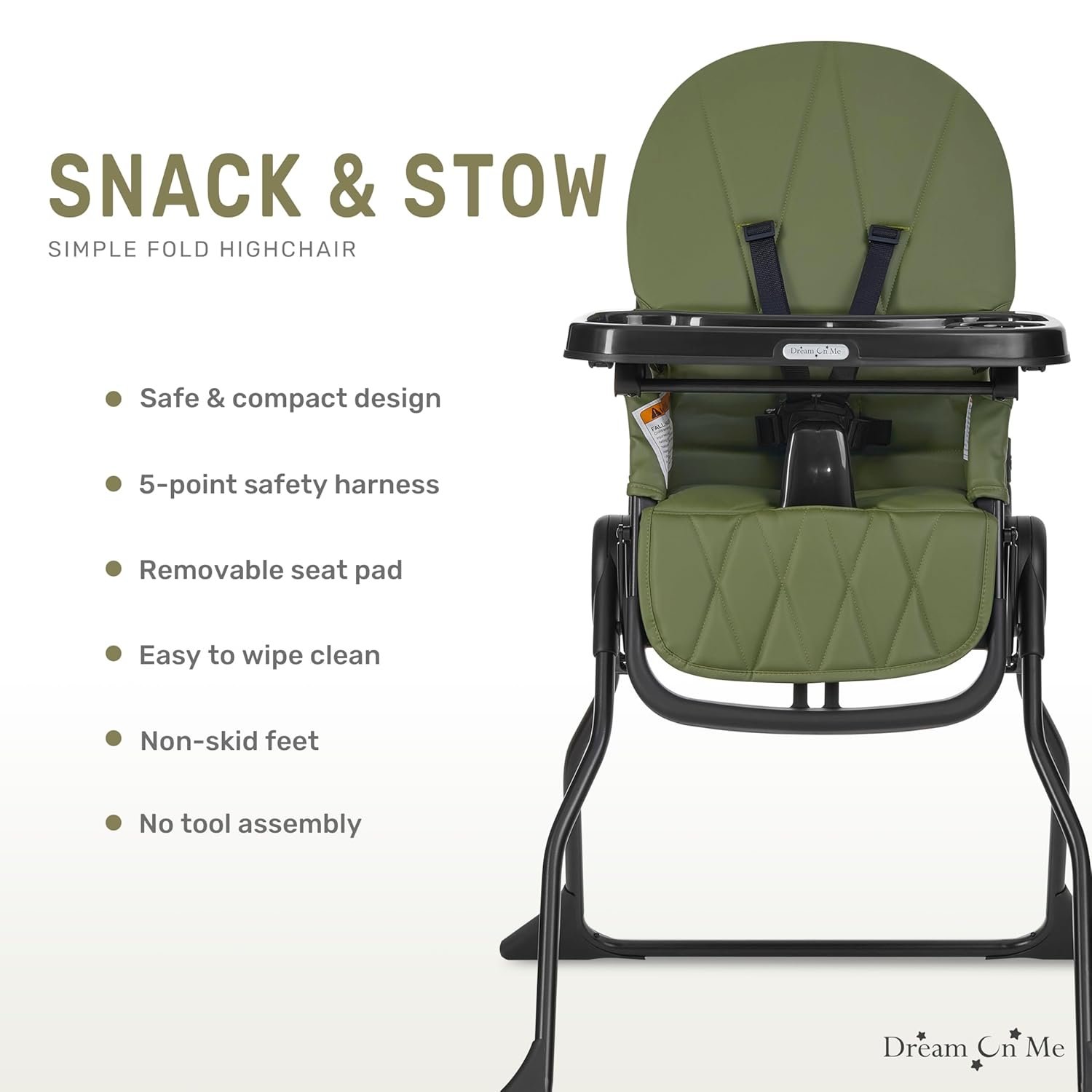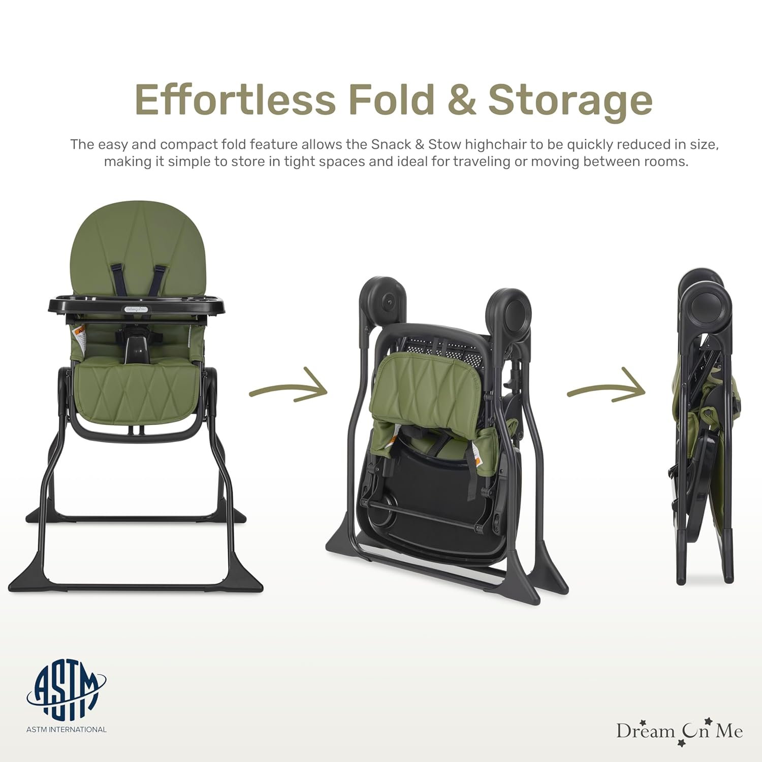 Introducing the Dream On Me Snack & Stow baby high chair, for hassle-free mealtime moments! Elevate your home decor while providing a comfortable seating solution for your little one. Effortless to store or transport when not in use, the Snack & Stow baby high chair features an easy and compact fold. Ensuring peace of mind for parents during mealtime, it meets/exceeds ASTM standards for safety and durability. Available in four chic variations—Olive, Cognac, Koala Gray, and Mauve – this lightweight highchair combines modern design with practical functionality. Product dimensions are 39.7” L x 32.2” W x 24.8” H, with a weight limit of 33 Lbs. This product can be used by children from 6-36 months.