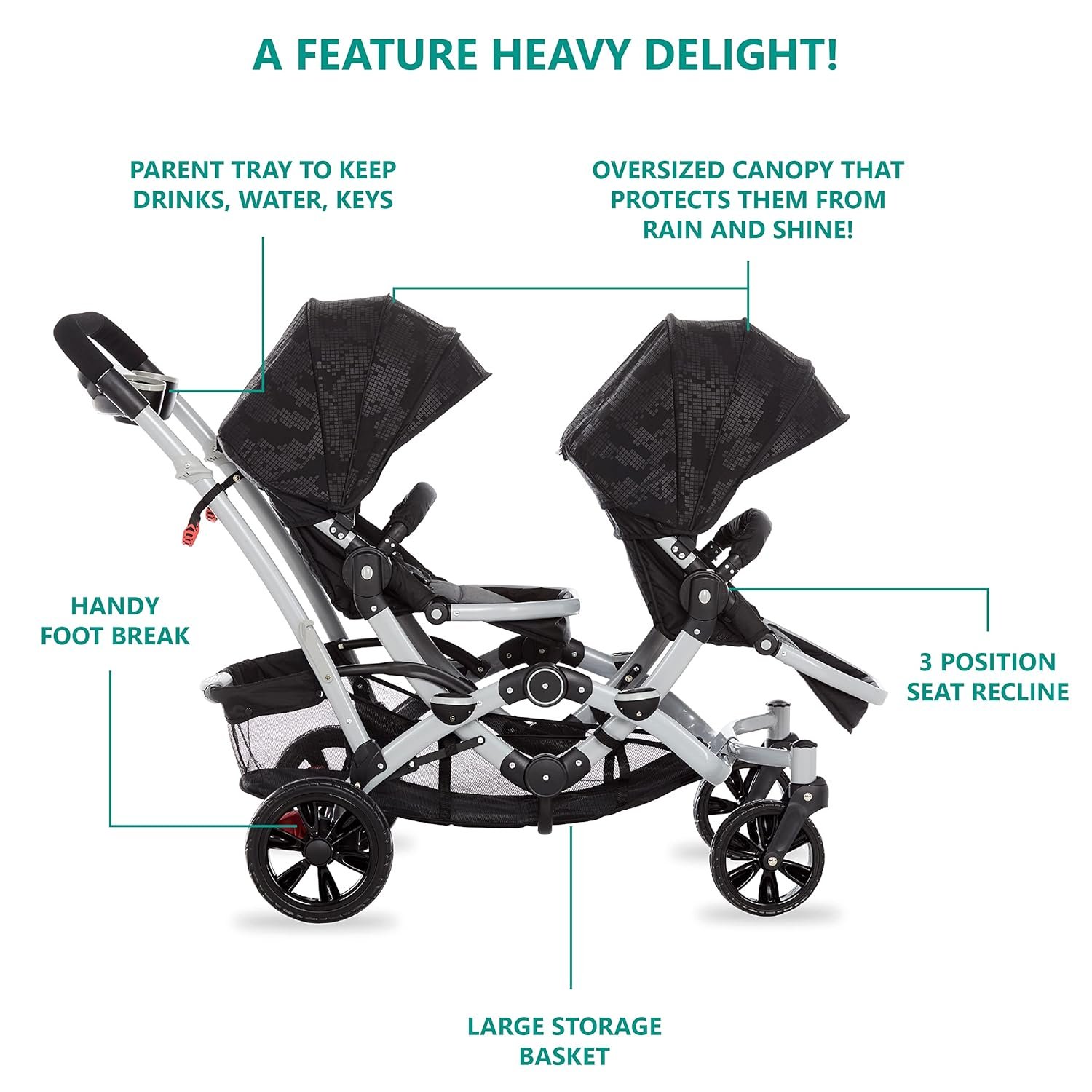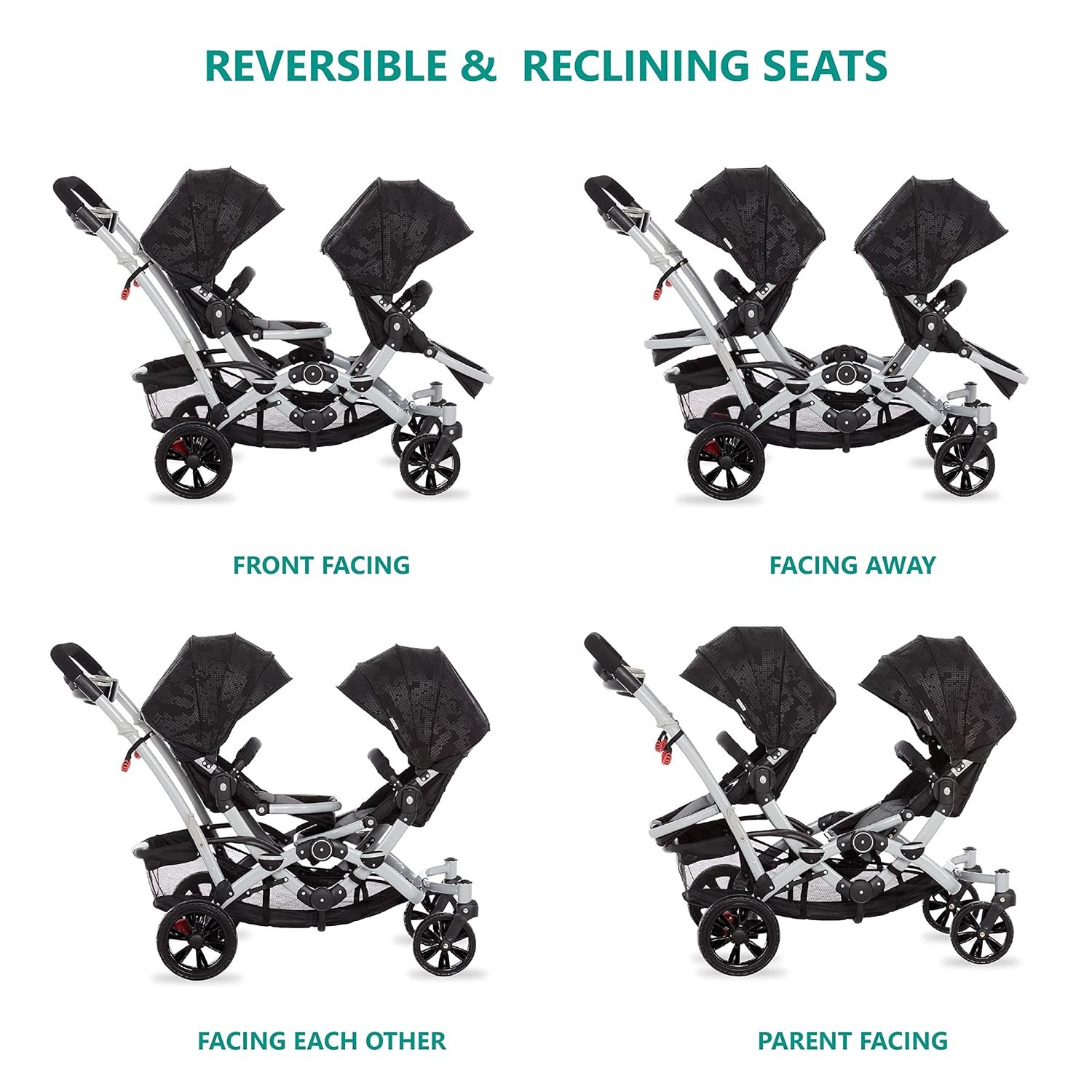 Functional seats: The front seat has an adjustable footrest with one-position seat recline while the rear seat reclines to 3 positions. The reversible seats let your kids be front facing, parent facing or face each other while you can run your errands.