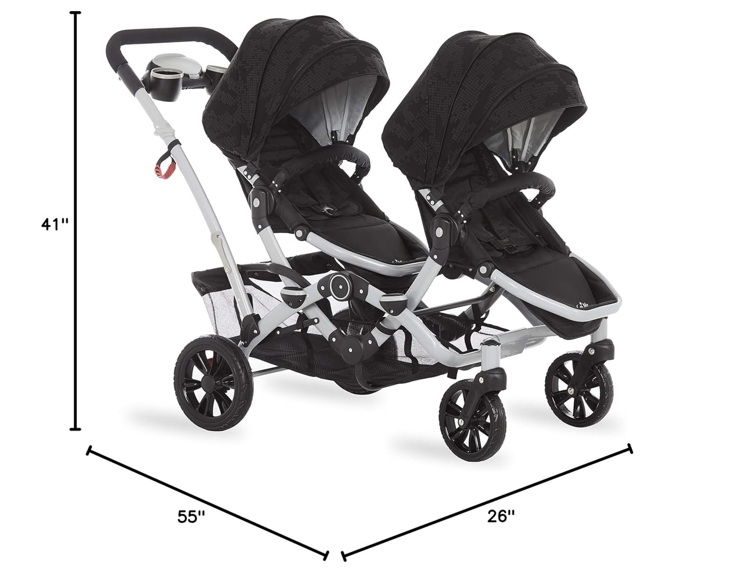 Taking two kids out on a stroller ride is a breeze, thanks to the Dream On Me track tandem stroller. The front seat has an adjustable footrest with one-position seat recline while the rear seat can recline three different positions. The reversible seats let your kids be front facing, parent facing or face each other – They can play while you can run your errands. Both front and rear seats have a 5 point safety harness. Dual front swivel, lockable wheels with suspension ensure superior maneuverability and a handy foot break in case you lose hold of the handle makes the stroller more secure. The large storage basket underneath can hold toys, groceries, and diaper bags. The parent tray is perfect to keep keys, money handy, and also has two cups for holding drinks. The track stroller folds flat for easy storage and travel – The storage latch auto-locks to keep it folded. The large adjustable canopy has a window allowing you to look It at the kids and provides shade. The stroller features a lightweight aluminum frame with high-end anodizing treatment. Product dimensions: 55Lx26Wx41H inches; Folded Dimensions are 22Lx26Wx41H inches. It weighs 41 lbs. And is available in light grey and Black.