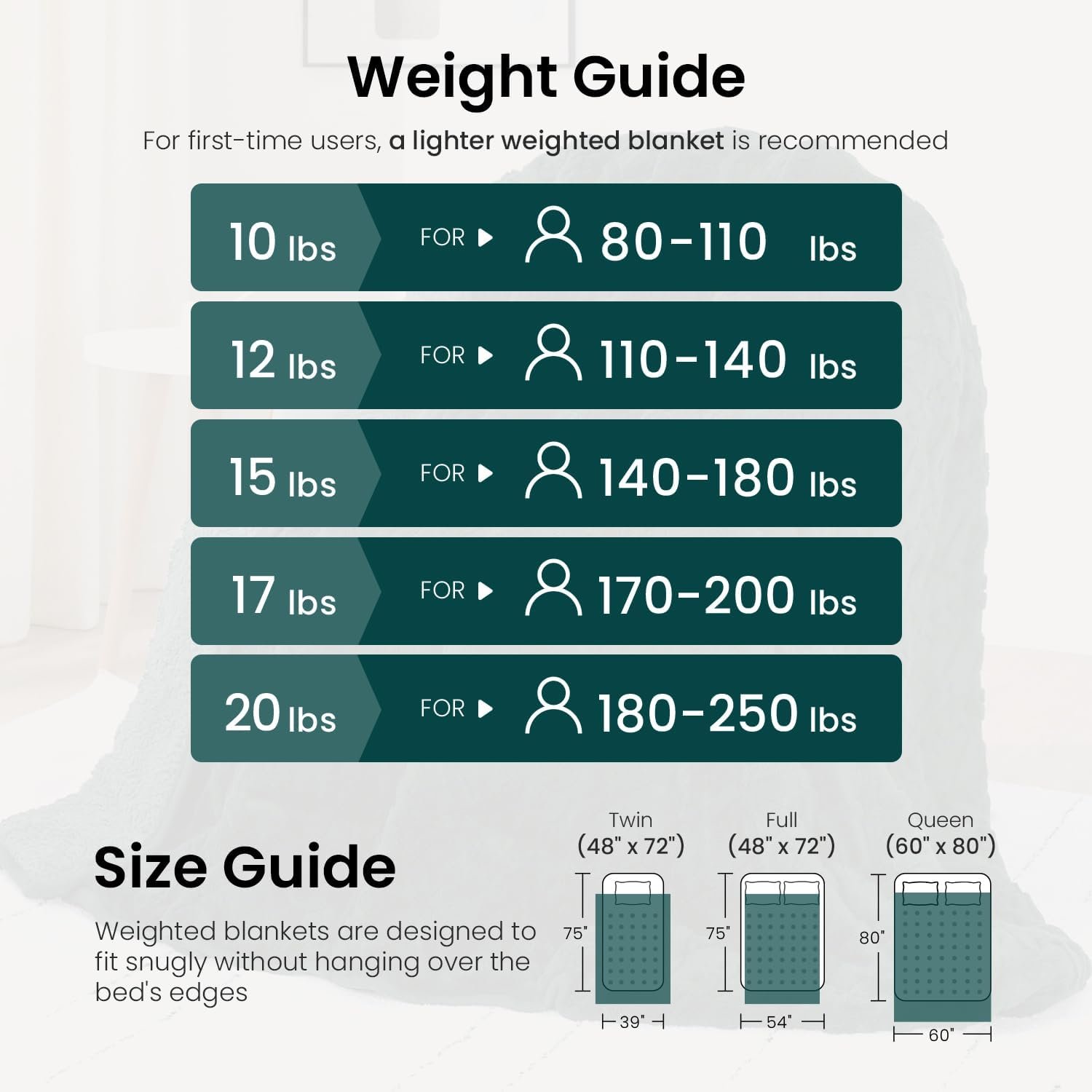 Multi-Functional: This weighted blanket for adults is available in queen size and twin size; 15lbs and 20lbs (recommended 8%-10% of body weight). It offers various colors (beige, grey, cream white, navy blue, grass green, purple, red ) for versatile use on the couch, bed, or as a decorative blanket, providing warmth and comfort for relaxation, reading, working, and cozy winter moments