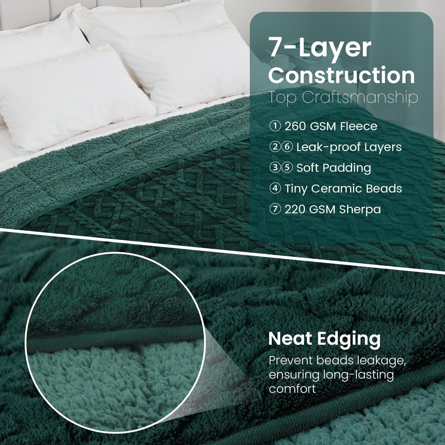 High-Quality Craftsmanship: With its innovative 7-layer design and 6 x 6 tightly stitched grids, our Sherpa weighted blanket enables the ceramic beads evenly distributed without any shifting or rustling noise. Spot clean or wash with a commercial washing machine, then tumble dry low or hang to dry. The soft blanket will maintain its texture after multiple washes