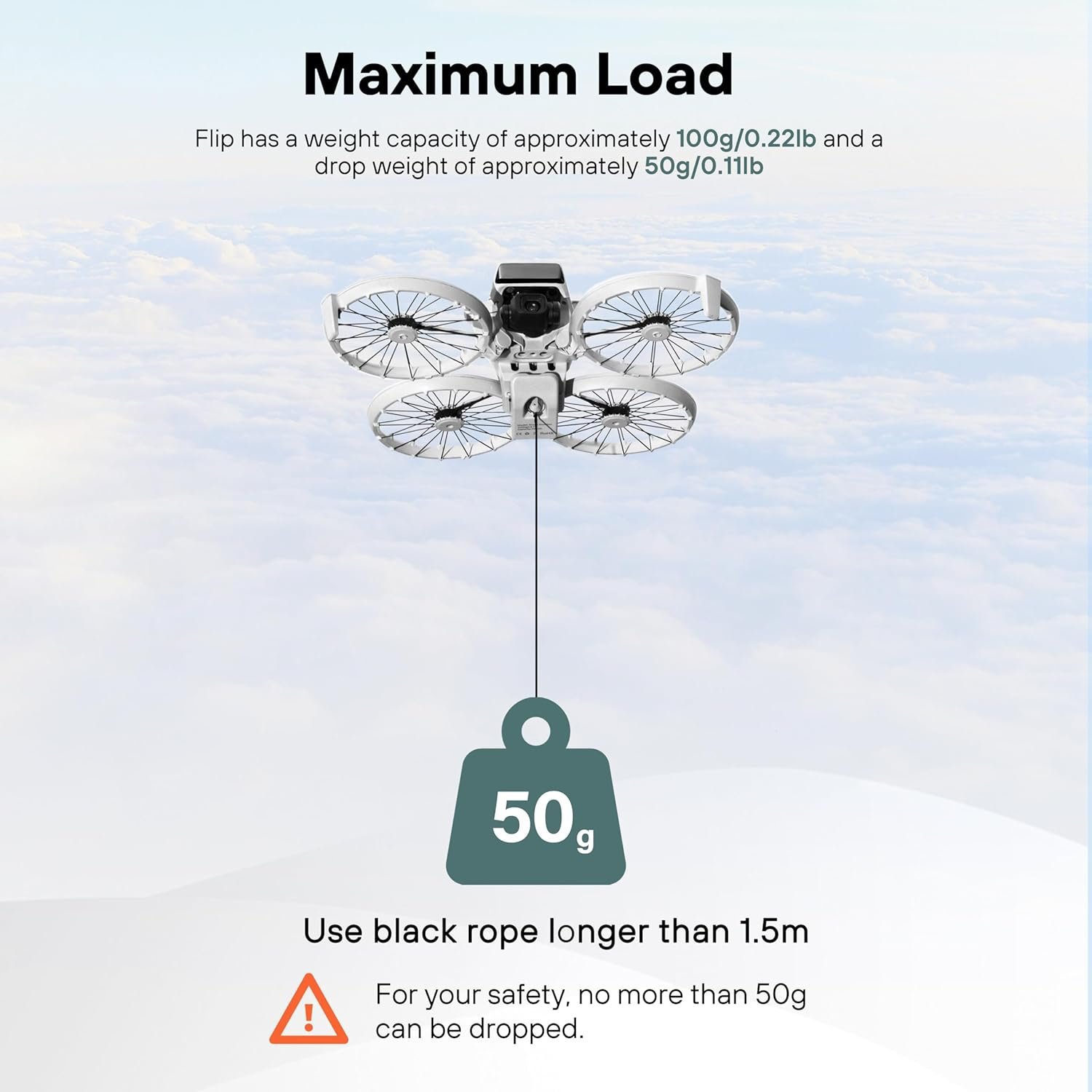 Note: The maximum weight of the FLIP aircraft is 100 grams, the drop itself is about 50 grams, and the use of the load should not exceed 50 grams; when dropping, it is recommended to fly at low speeds and to rotate the drop slowly (drones are not included in the parcel)