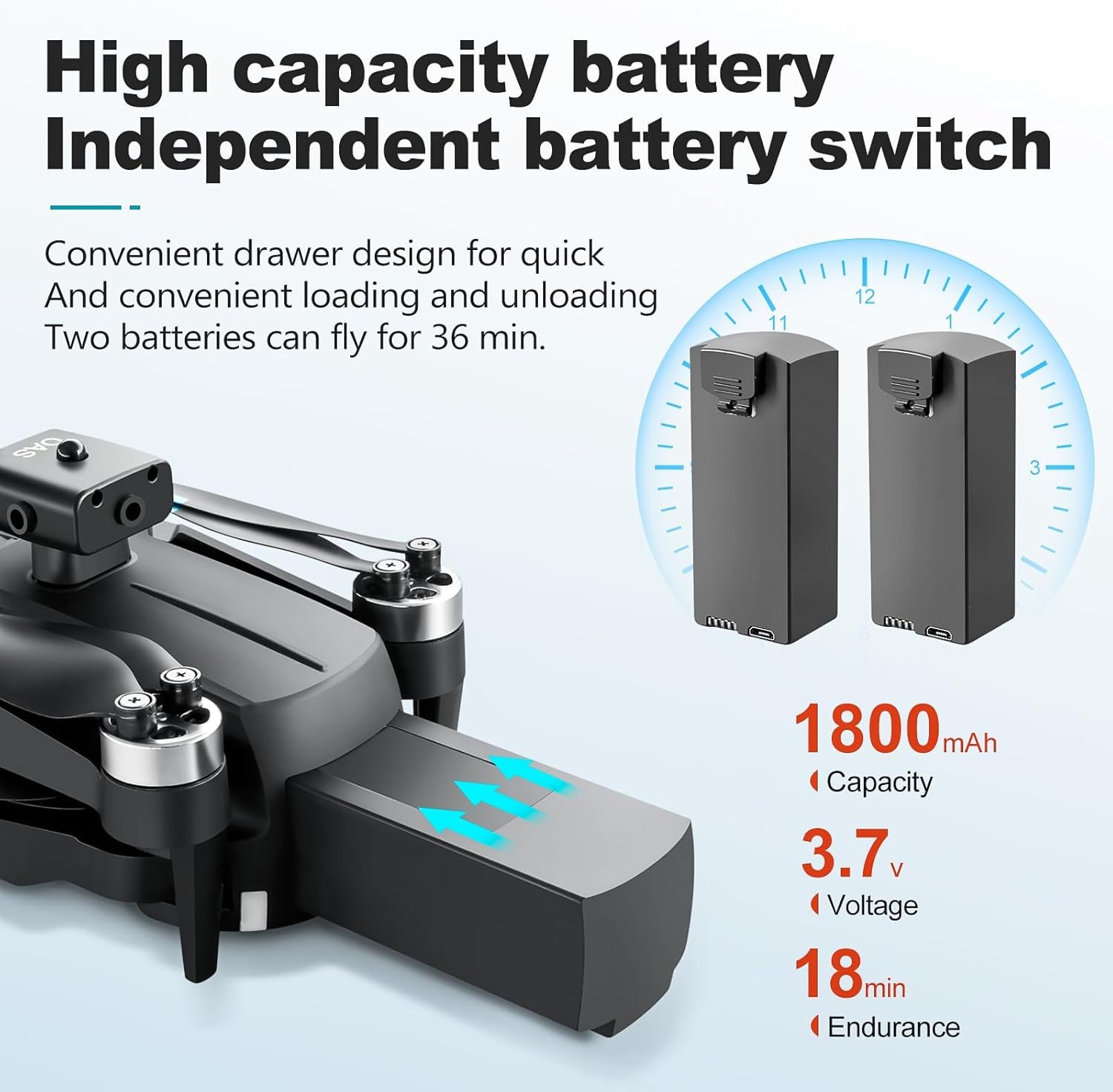 Longer Flight Time: The FPV drone for adults and kids 9-12 with two rechargeable batteries, each providing about 18 minutes flight time. 2 batteries can be swapped and charged in rotation, greatly extending the fun time. Note that more flips and faster speeds will reduce the flight time per battery.