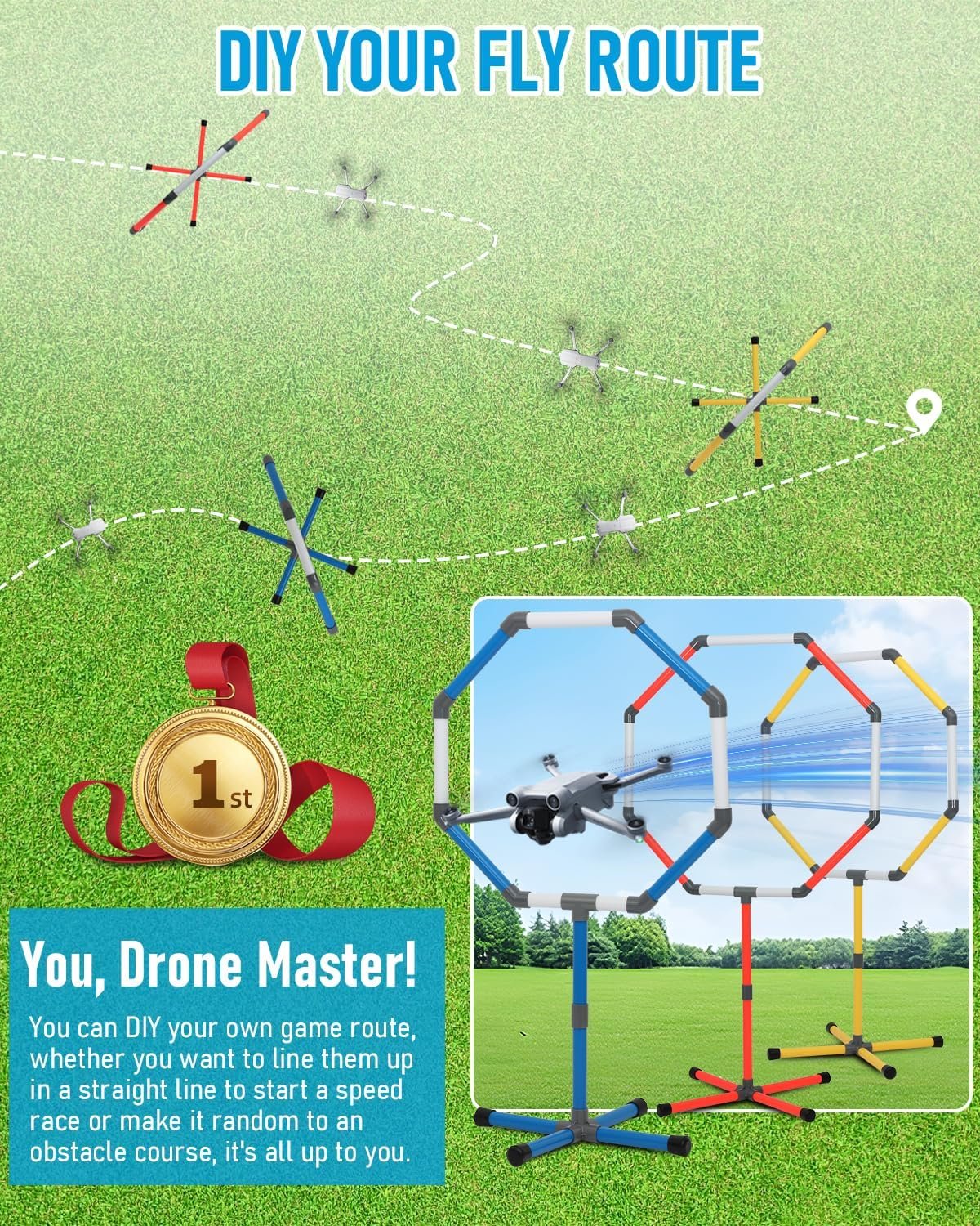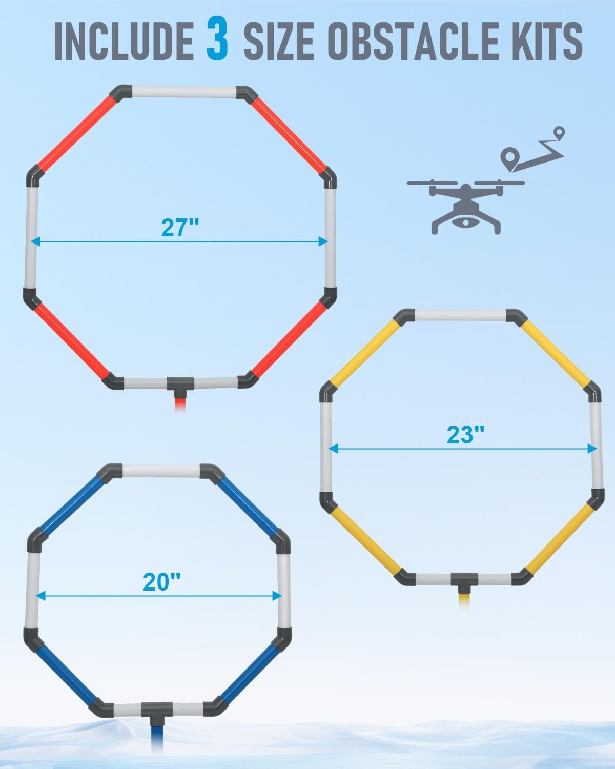 【3-Size Progressive Training System】 Master FPV racing skills with our multi-stage obstacle course! Featuring 20″/23″/27″ diameter hoops for beginner to advanced challenges. Create custom race routes to improve precision flying and obstacle avoidance techniques (drone not included !)