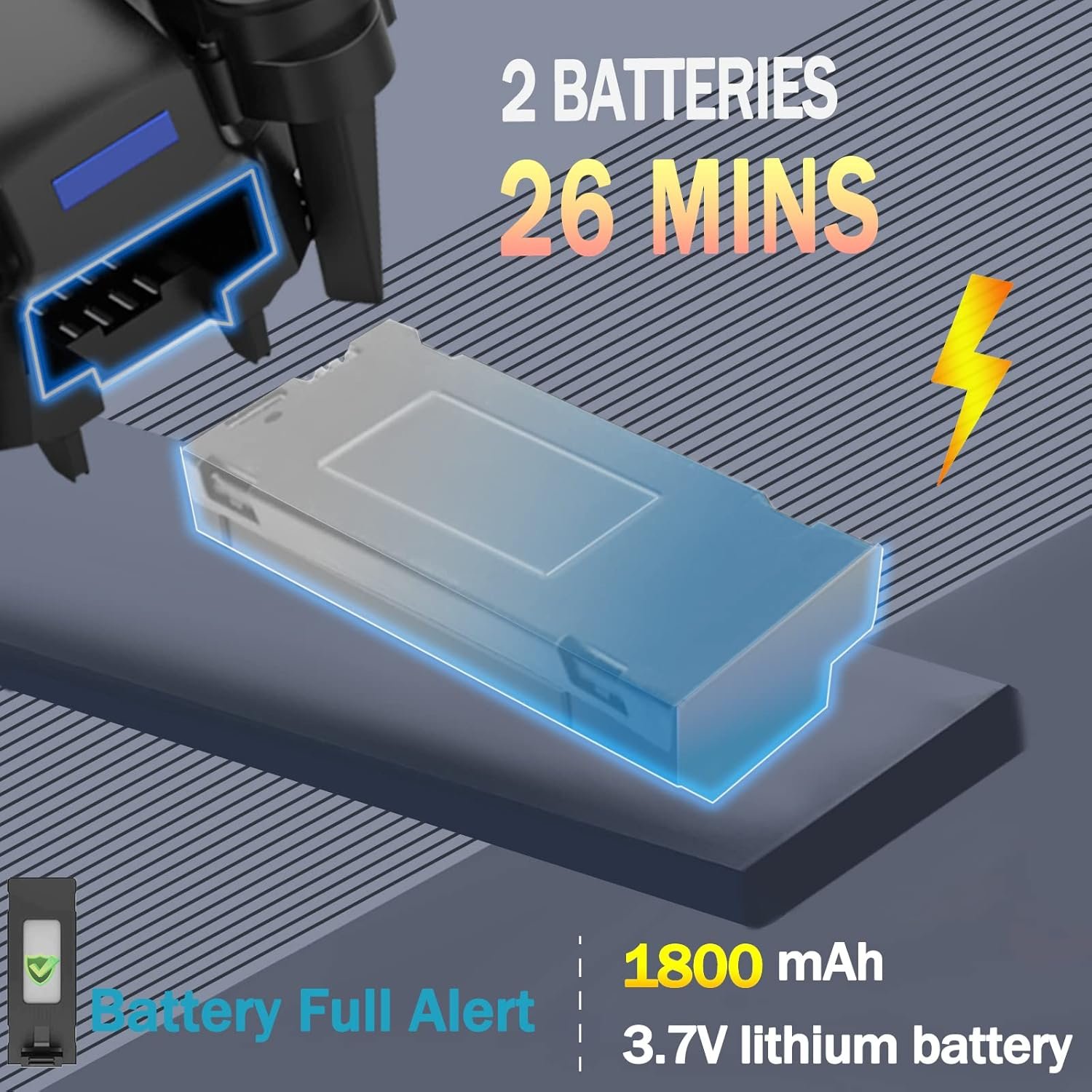 Video/Photo Resolution HD 1920*1080P Drone Battery 2 X 3.7V 1800 mAh Flight Time 10-15mins/per battery (depends on the speed) Battery of Controller 3 X 1.5V AA Battery (Not included) Control Distance 90-100 meters (depends on phone device and environment) FPV Transmission Range 82 feet/ 25 m (depends on phone device and environment) Battery Charge Time About 90 minutes