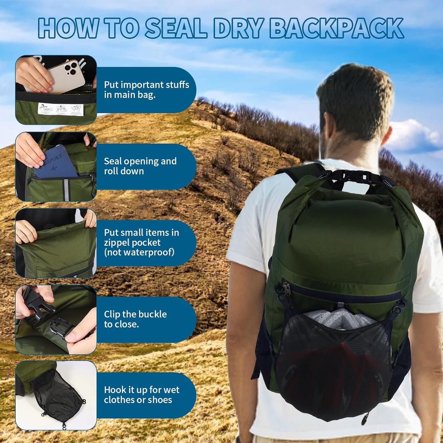 【Dry & Wet Separation Mastery】 Featuring an innovative compartment design, this dry bag backpack waterproof keeps your gear organized: Main compartment: Fully waterproof for dry items. Front zippered pocket: Ideal for wet clothes or towels (non-waterproof). Hidden mesh bottom pocket: Perfect for storing wet shoes, towels, or other damp items.