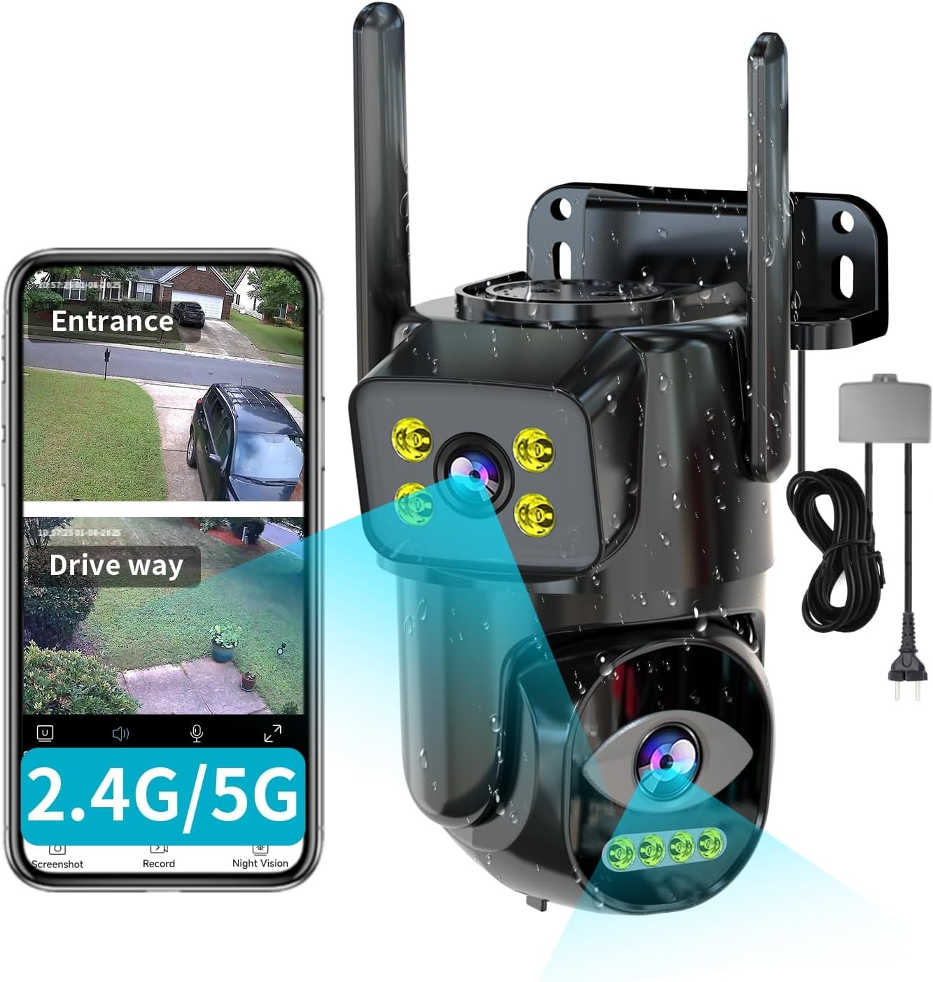 【Plug-in,Easy play & Support 2.4GHz and 5G & 7/24 recording 】The power source for this outdoor camera is a household electrical outlet. The camera come with adapter, you just need to plug-in,connect camera to your home wifi 2.4GHz/5G,and mounting. Very friendly for new user. (The user manual may incorrectly state that only 2.4G is supported; please disregard that information)This cameras for home security supports 7/24 recording to the SD card(SD card not included), you can playback any moment. you can remote view at anytime and anywhere. This outdoor camera , you could connect to your home security system(DVR/NVR),a good choice for replace the old camera