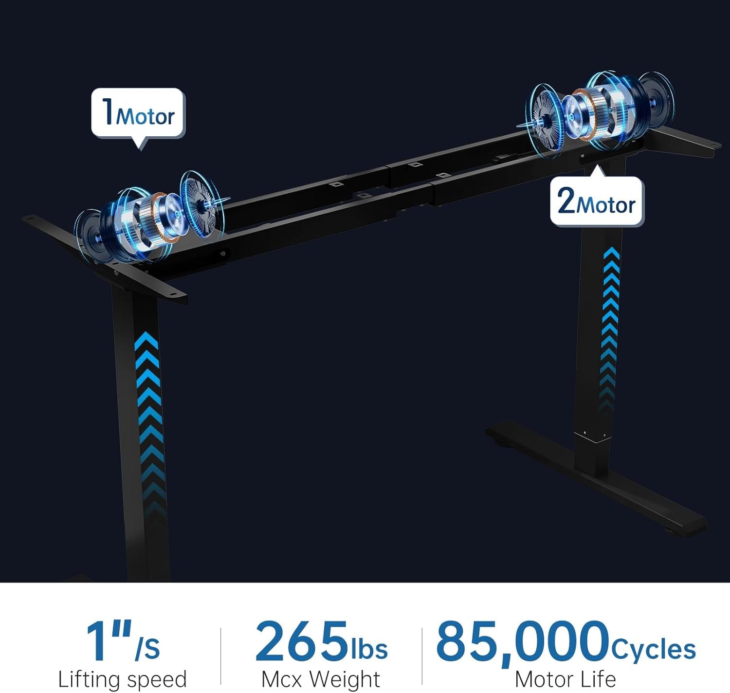 Powerful dual motor electric lift system: Dual Motor Standing Desk Frame it can adjust the height smoothly, evenly and quickly, and at the same time you can hardly hear the sound.Dual motors for higher load capacity and longer service life.