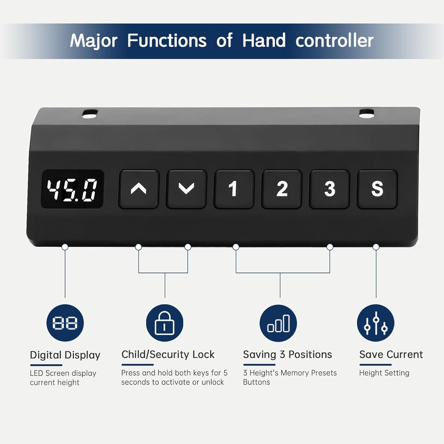 Newly Designed Hand Controller: 3 height memory buttons allow you to set three heights. You can switch the height unit (cm/inch). You can set the height according to the thickness of your table board.