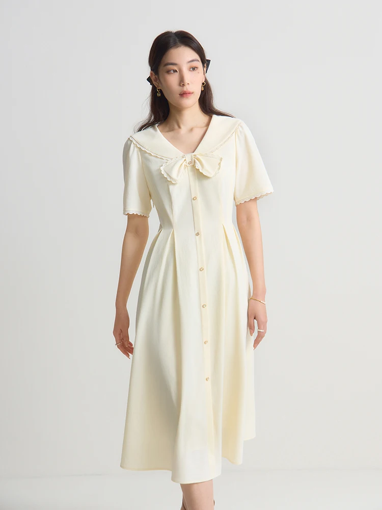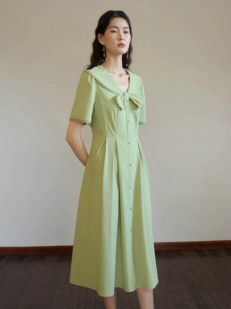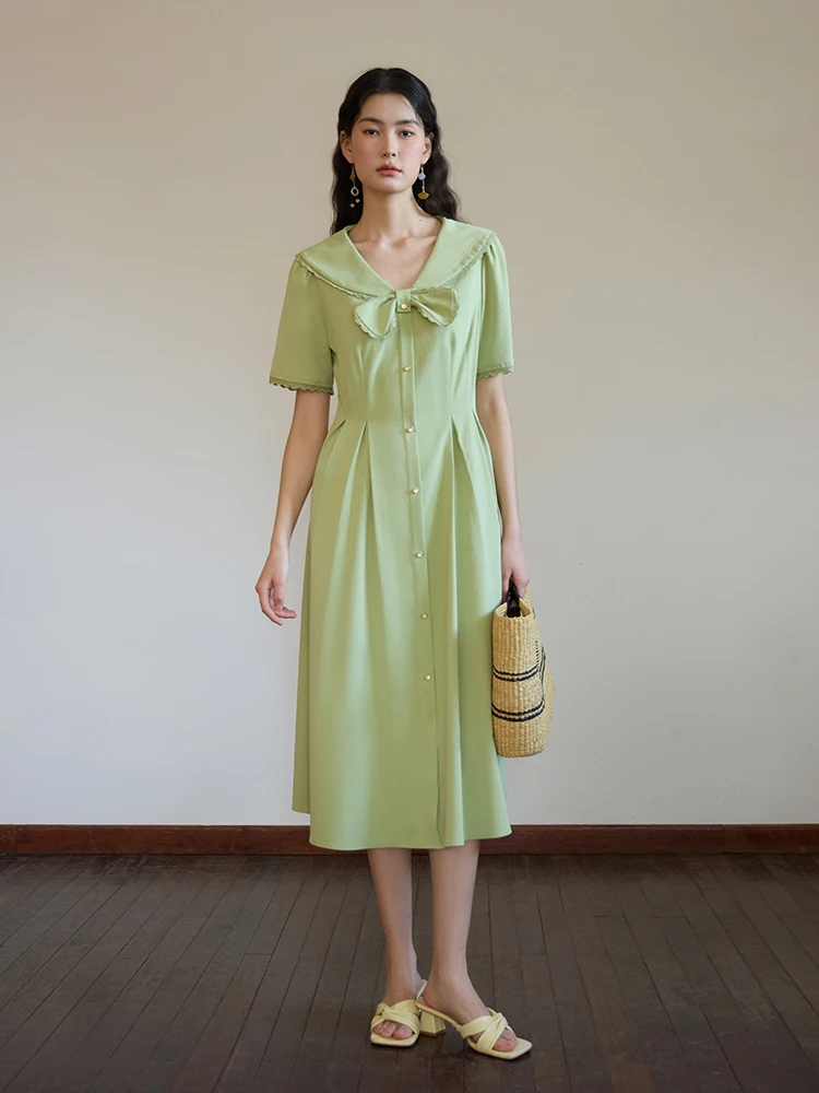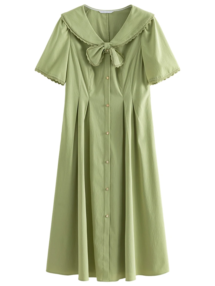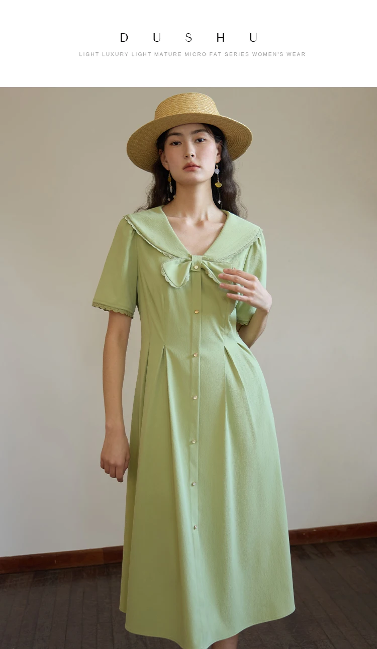 DUSHU 【2 Colors】Sweet Peter Pan Collar Design Women Single Breasted Dress Green Short Sleeve Mid-Calf A-LINE Skirt 24DS82275