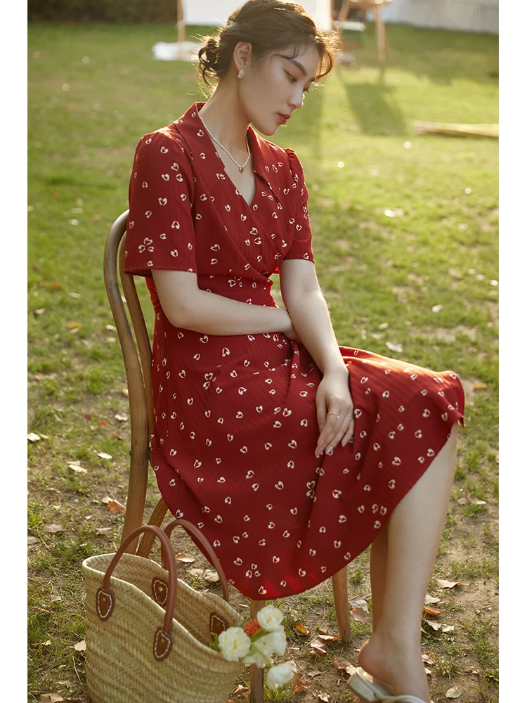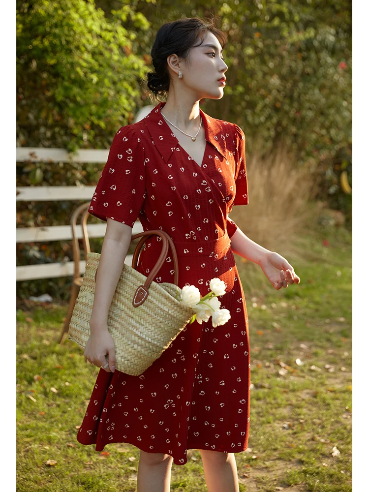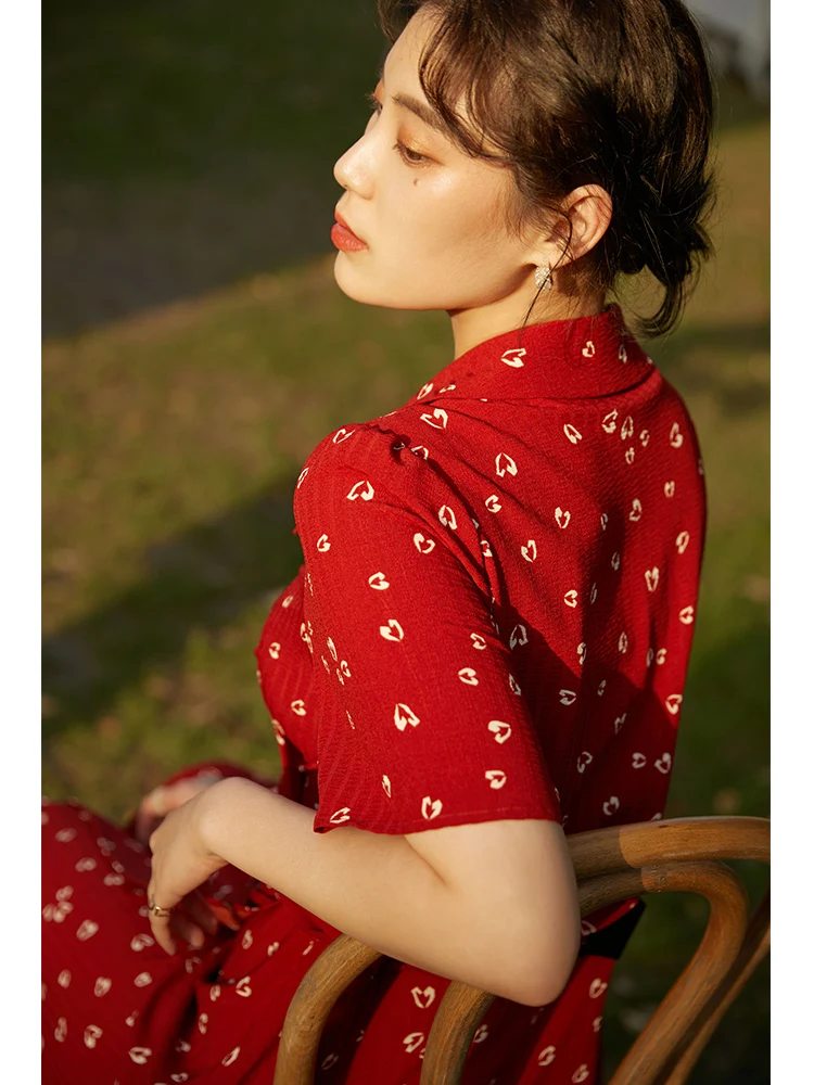 DUSHU Women Dress Summer Retro Red Floral Chiffon Dress Office Lady Short Sleeve A-LINE Skirt Clothes For Women Print Dresses