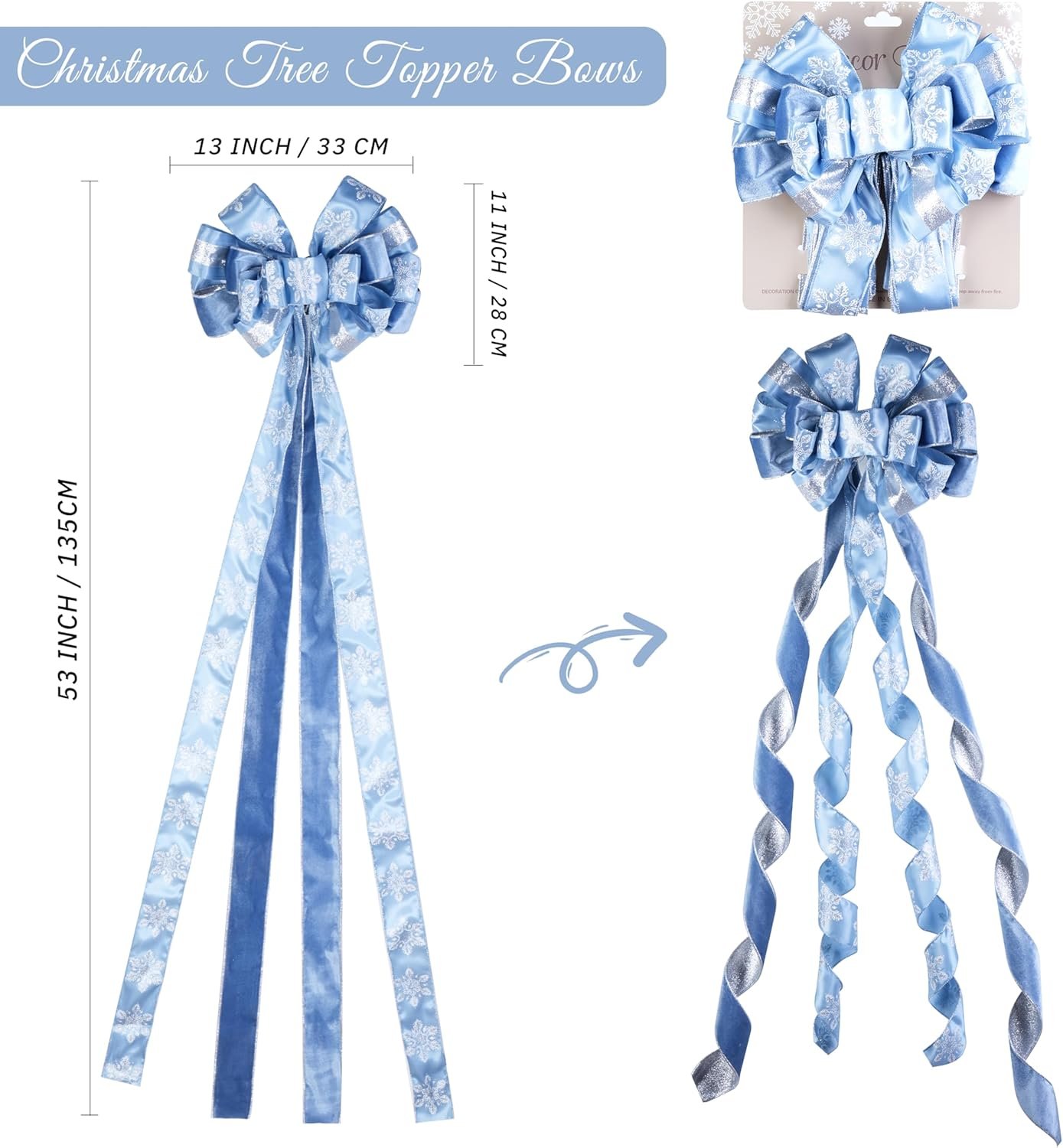🎄Perfect Size: Measuring an impressive 13 x 53 inches, this Christmas tree topper bows are crafted to crown any tree, the tails can be easily trimmed to suit the height of your tree, ensuring a flawless fit every time