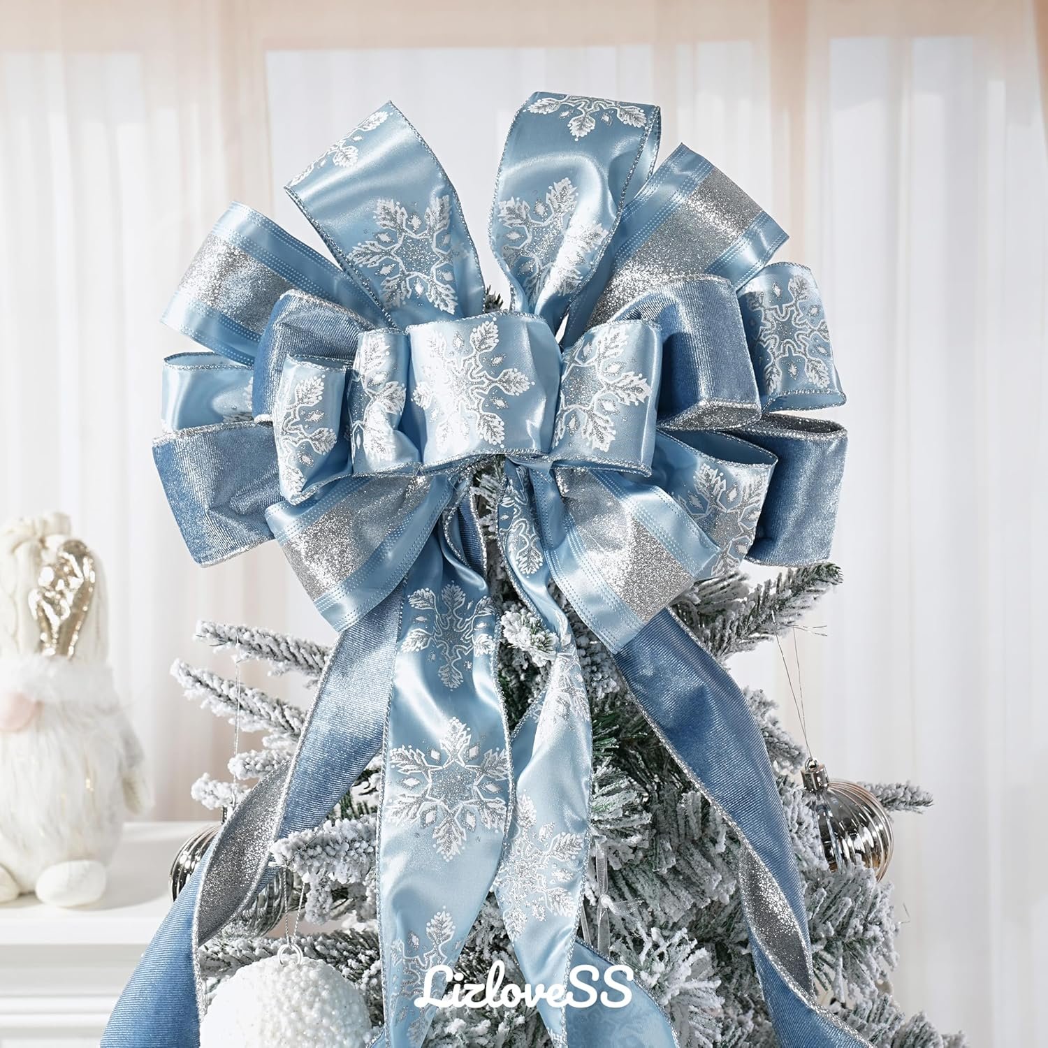 Dusty Blue and Silver Christmas Tree Toppers 13 x 53 Inch Large Decorative Bows with Streamer and Snowflake Patterns for Xmas Tree Wreaths Door Staircase Home Decor