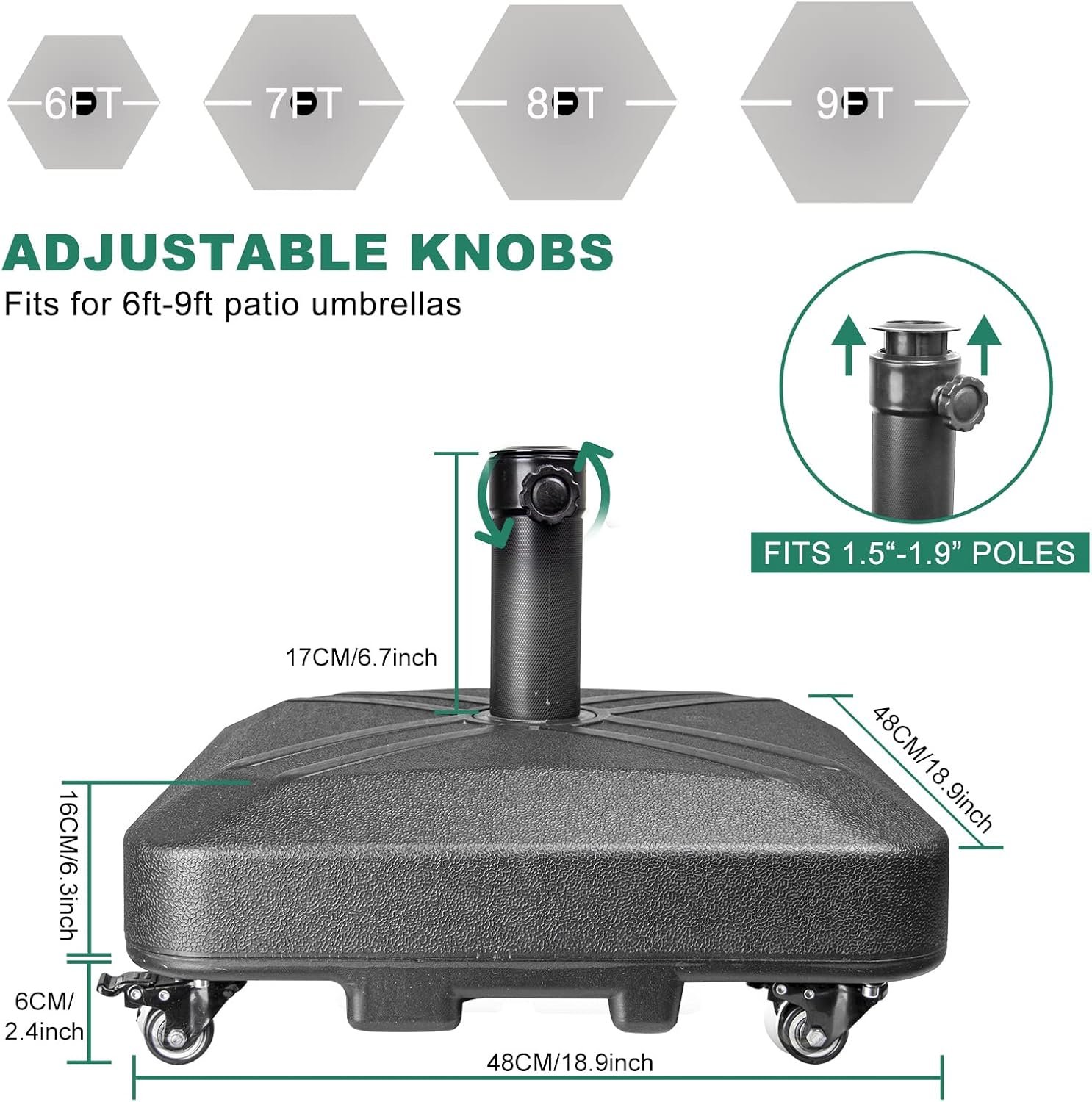 Multifunctional: This heavy duty umbrella base features a steel pipe, fit pole 1.5-1.9FT , perfect for holding 6-10FT umbrellas.