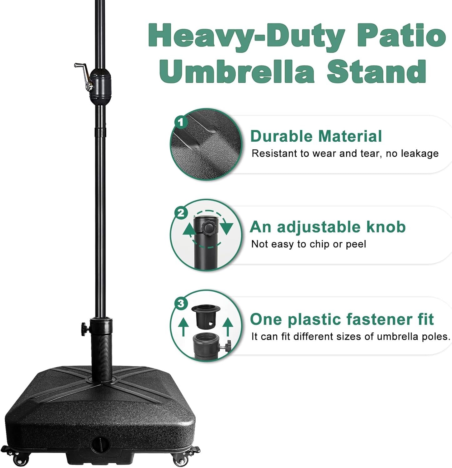 Heavy Duty: umbrella base can holds up to 41.8 pounds of sand or 19 liters of water.
