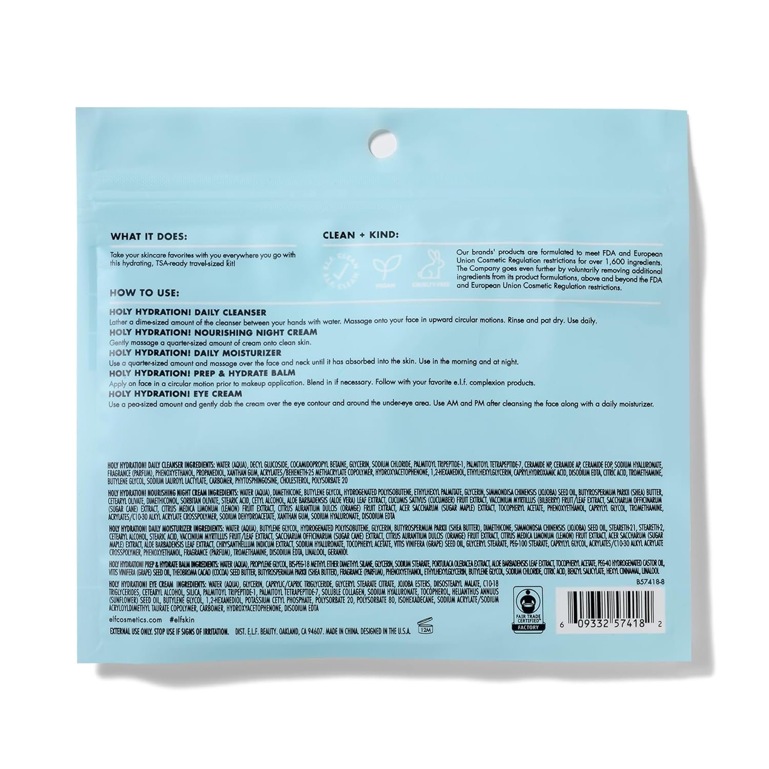 SKINCARE ON THE GO: The e.l.f. Jet Set Hydration Kit contains all of your skincare favourites in a TSA-ready travel-sized kit. The kit includes a Cleanser (30ml), Hydrating Balm (6g), Moisturizer (25ml), Eye Cream (7g) and Night Cream (15g).