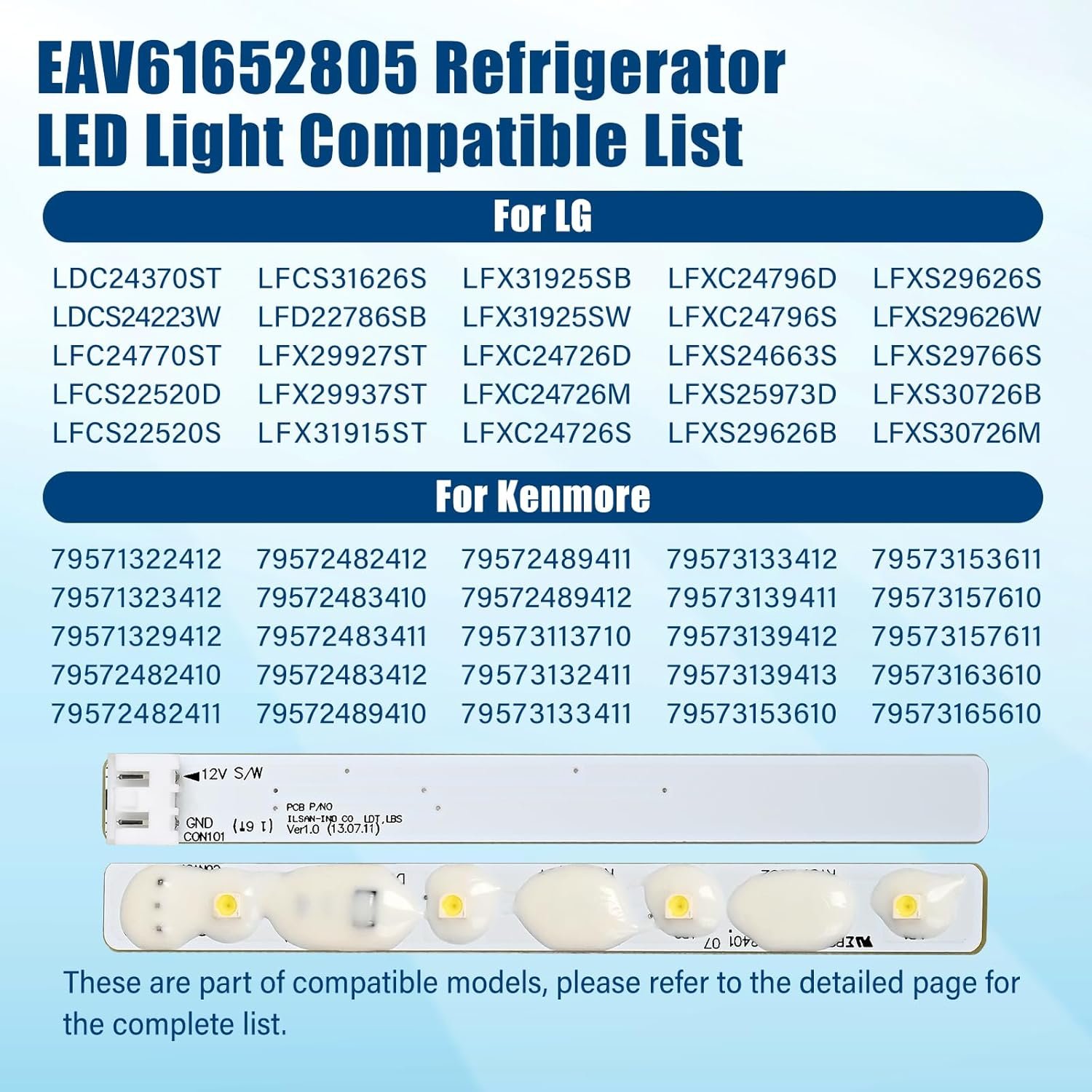 【Compatible With】The EAV61652805 refrigerator LED light assembly compatible with LG, Kenmore. Please refer to the model in the main image for details. If you are unsure, please contact us in time and we will confirm and reply as soon as possible.