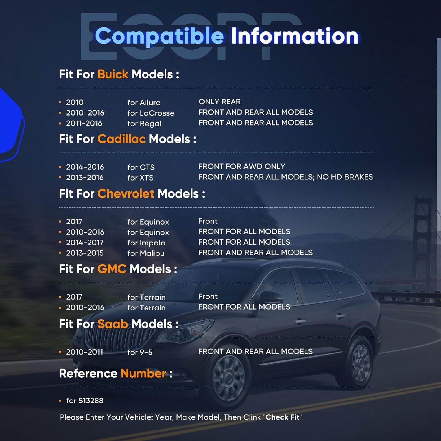 Front fitment: 2013-2015 for Chevrolet Malibu;2016 for Chevrolet Malibu Limited;2011-2017 for Buick Regal;2013-2016 for Cadillac XTS;2017 for Cadillac XTS (Except Brake Code J55);2010-2016 for Buick LaCrosse;2014-2017 for Chevrolet Impala;2020 for Chevrolet Impala (3.6L V6);2014 for Cadillac CTS (3.6L V6);2015-2016 for Cadillac CTS (AWD ONLY);2010-2017 for Chevrolet Equinox;2010-2017 for GMC Terrain;2010-2011 for Saab 9-5