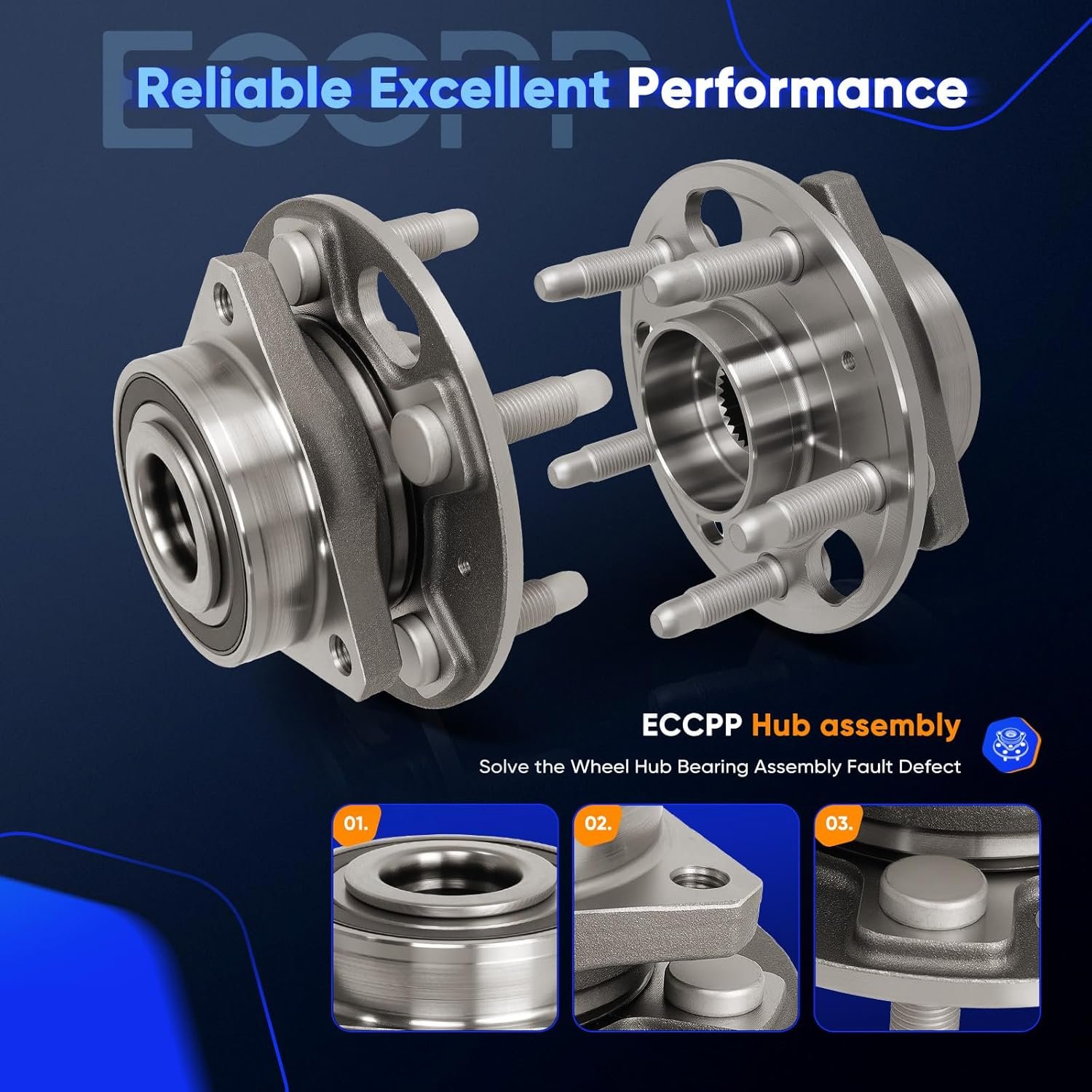 PREMIUM FEATURES – ECCPP wheel bearing assemblies manufactured by high-quality materials for ensuring precisely matches, durability, reliability and premium performance. The high-quality seal design with superior anti-pollution protection, ensuring that the hub bearings are clean, long lasting and minimizing noise and vibration. Wheel bolts with protective coating that helps prevent rust and corrosion and makes it easier to disassemble and properly twist the wheel nuts