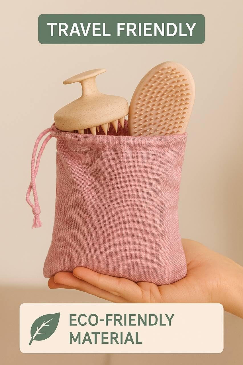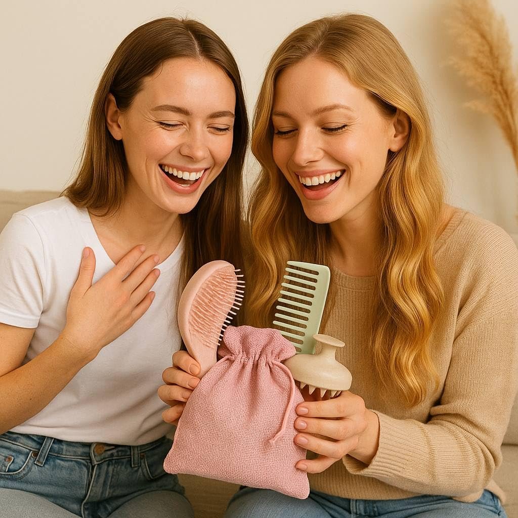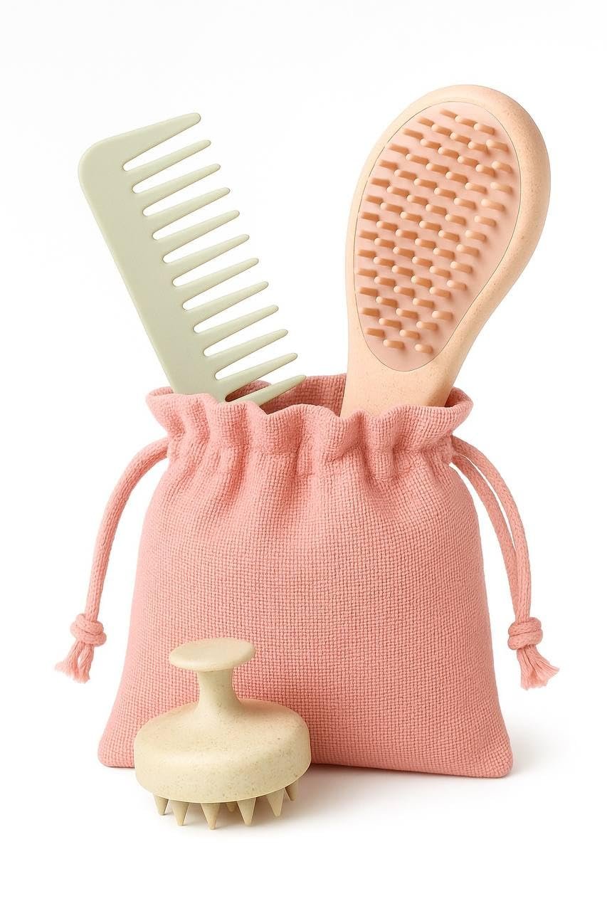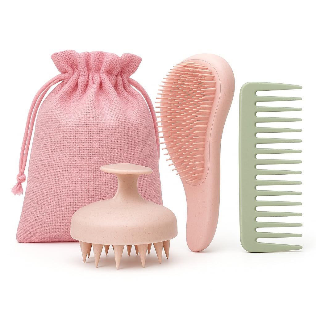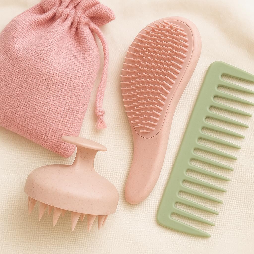 Eco-Friendly Hair Brush Set – 3-Piece Biodegradable Detangling Kit with Scalp Massager & Linen Bag – Wet & Dry Use – For Women & Girls – Gift-Ready
