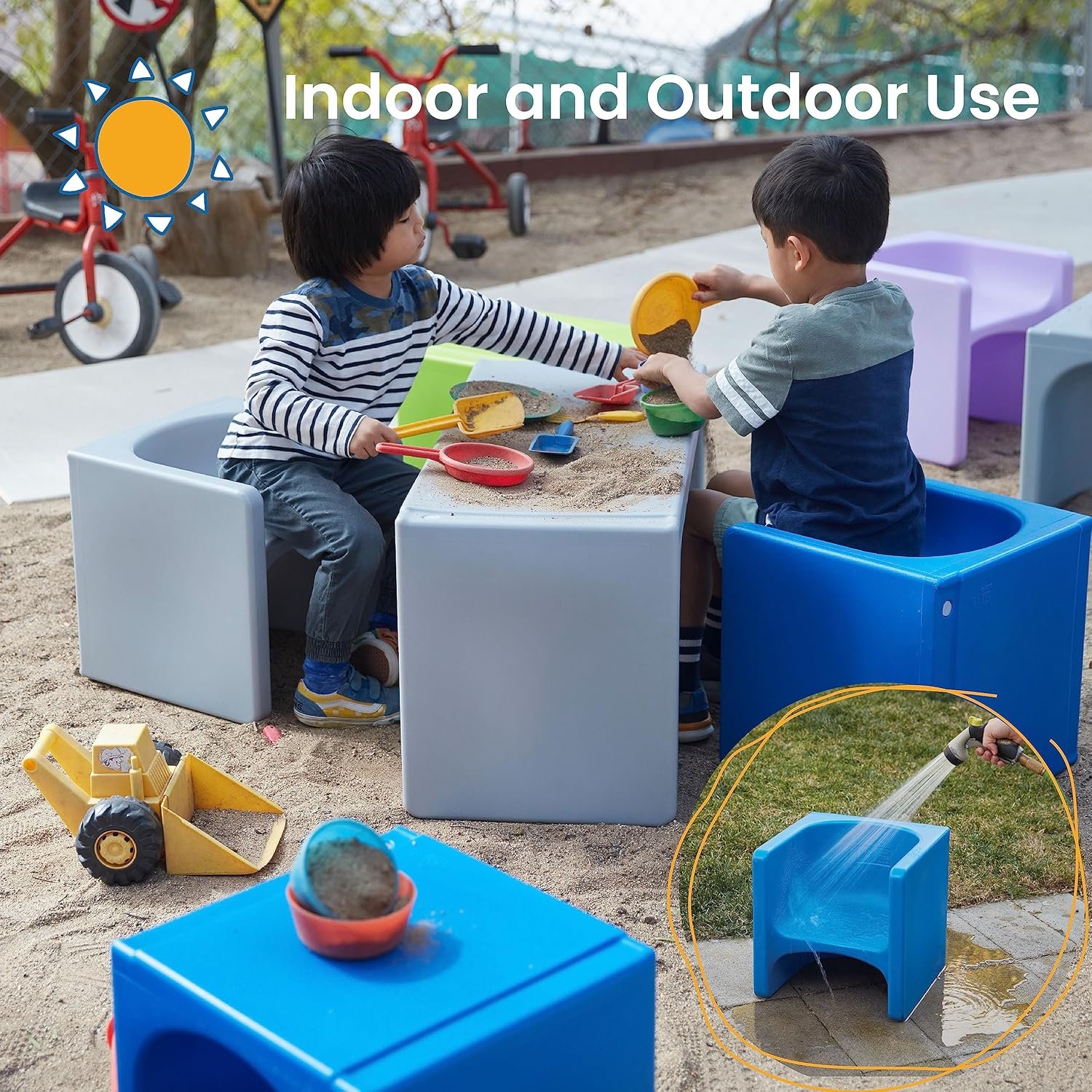 Durable Design: Children’s furniture is lightweight, UV-protected, and has no hardware to maintain for use indoors and outdoors; the chair has indented grooves to stack for space-saving storage