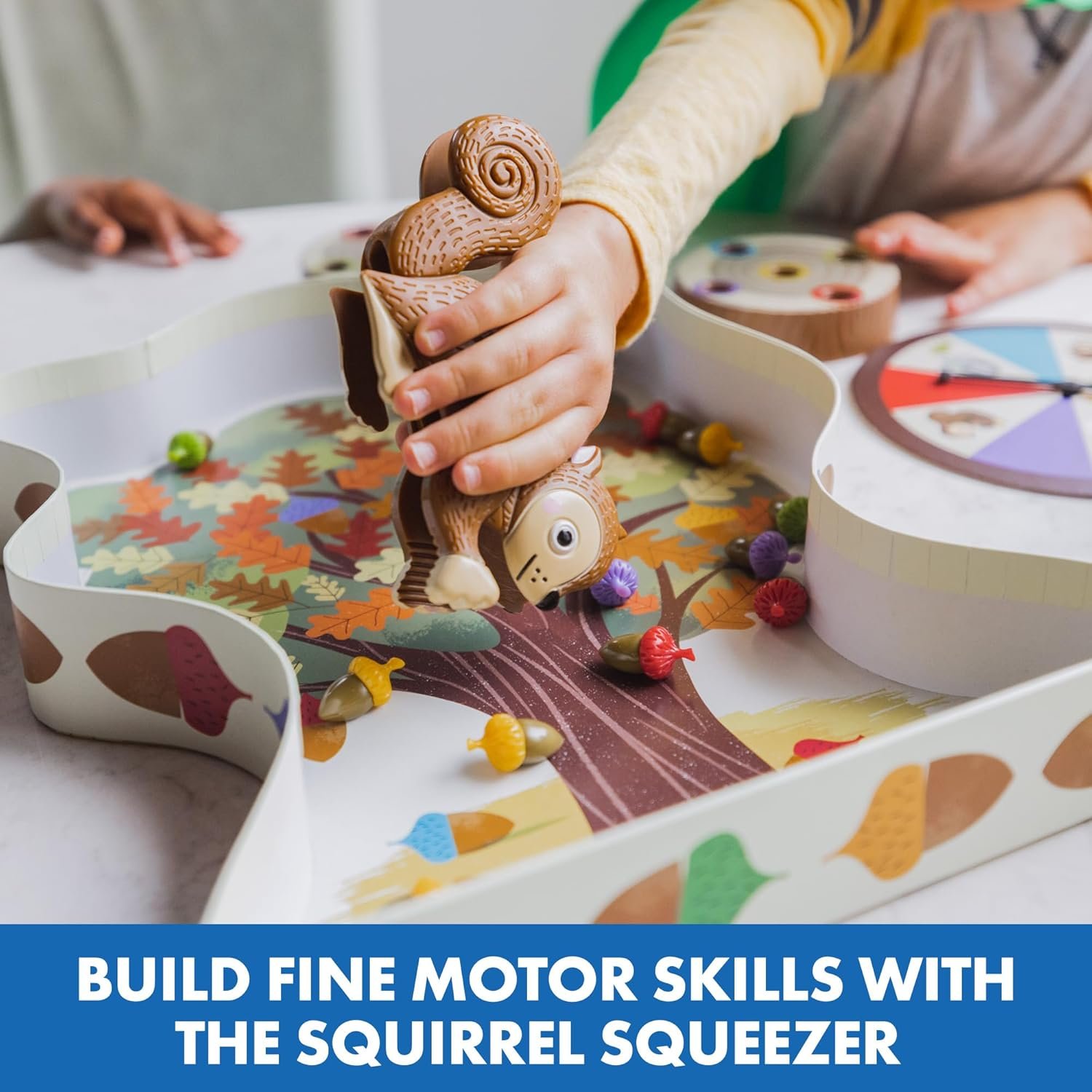 INCLUDES: Sneaky the Squirrel Squeezer, 20 acorns in 5 colors, 1 spinner, 4 logs, instruction guide, and tree-shaped game board that doubles as the box for easy setup, cleanup, and storage