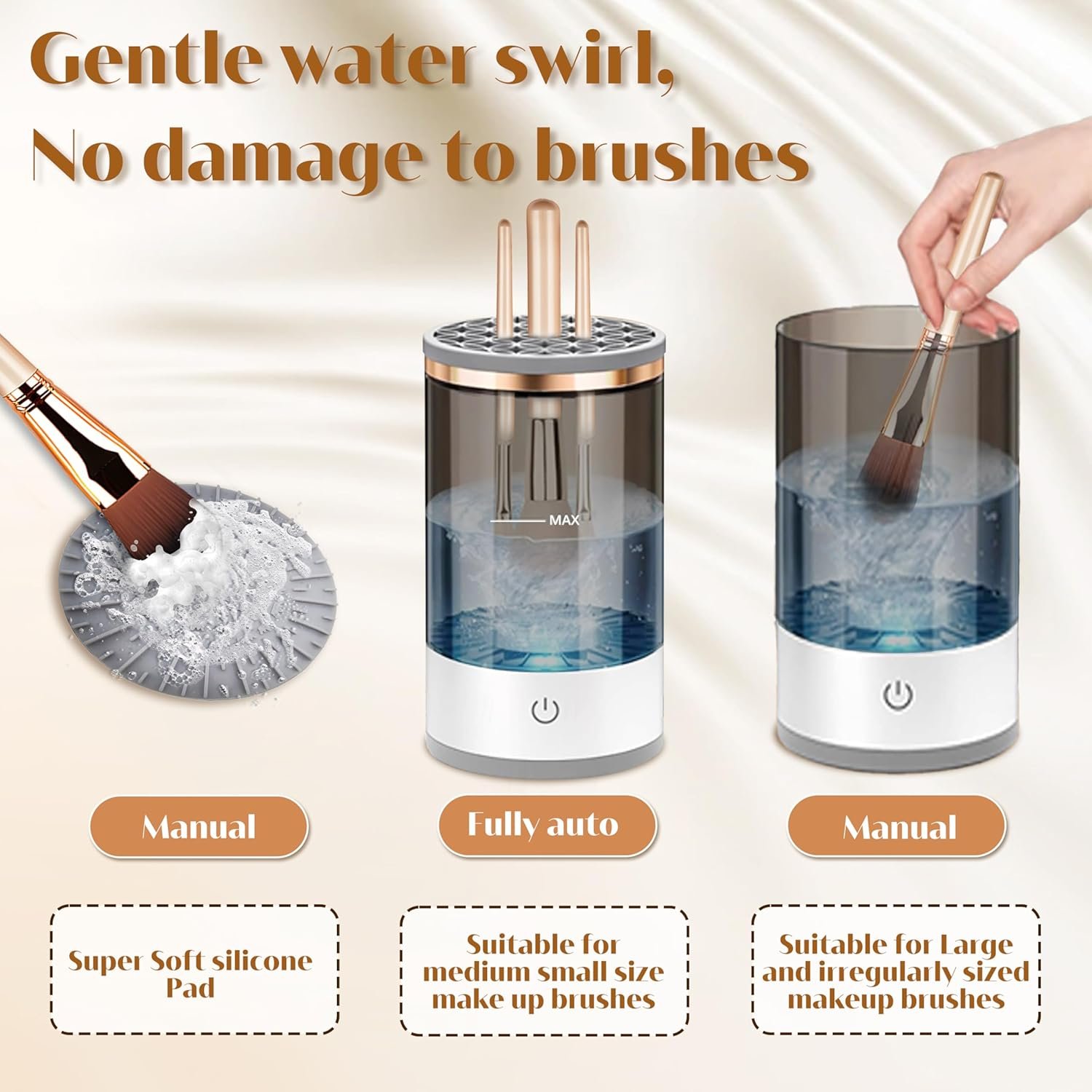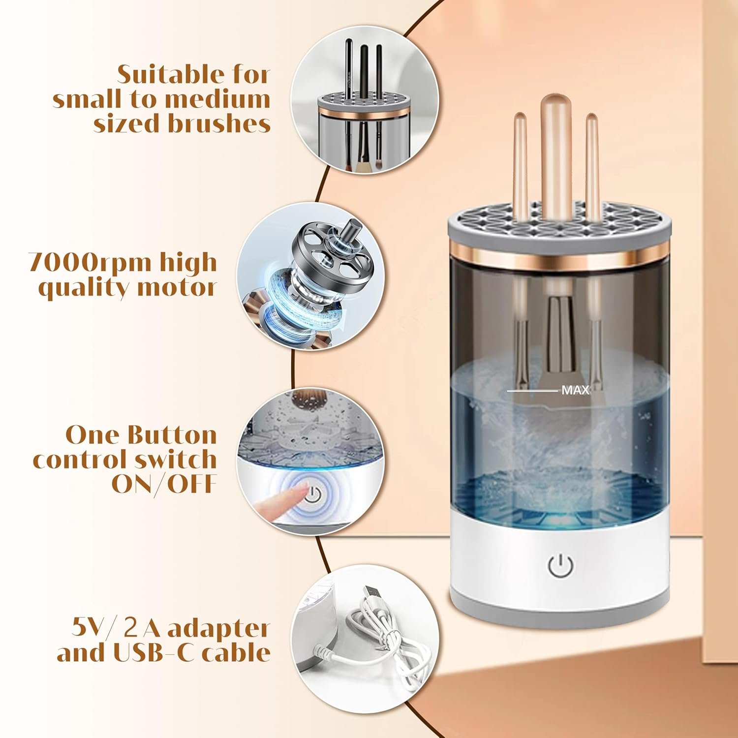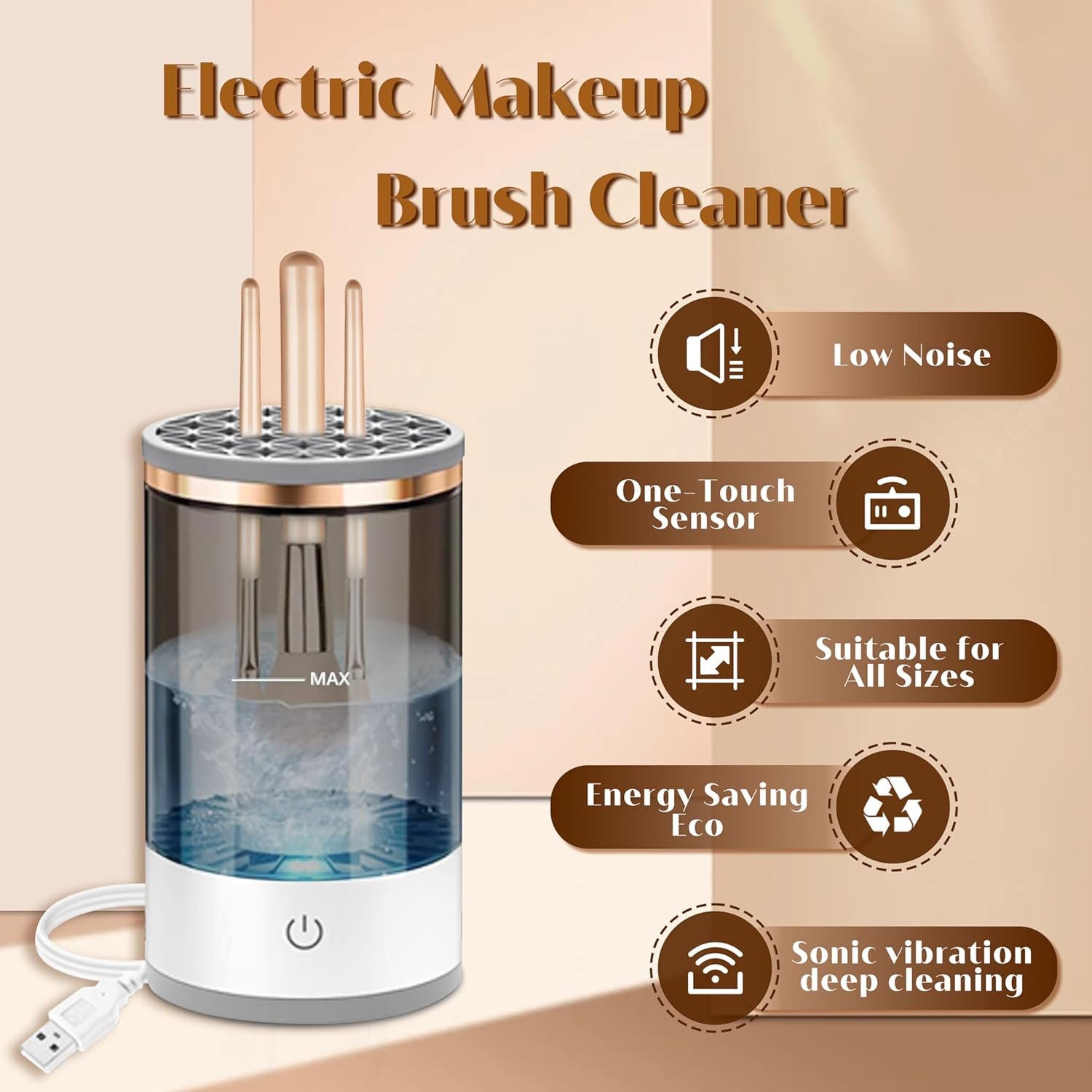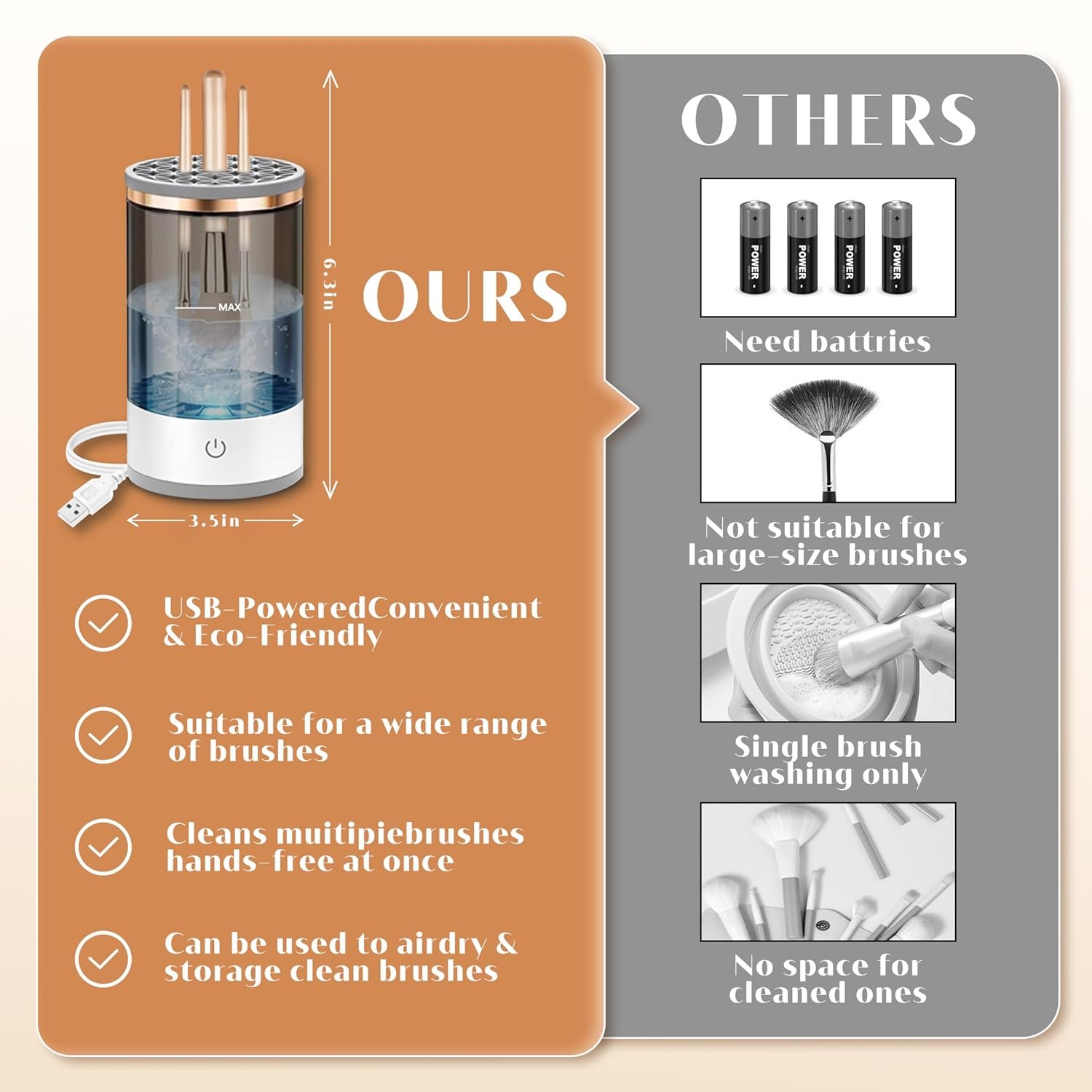 [New Upgrade] This electric makeup brush cleaner has undergone a new upgrade. It now utilizes USB charging for a more environmentally friendly power source, replacing the previous battery option. The cleaner can accommodate 3-4 makeup brushes simultaneously, allowing for faster and more efficient cleaning. Additionally, we provide a super soft silicone makeup brush cleaner mat, perfect for cleaning oversized and irregularly shaped brushes either with the machine or manually.